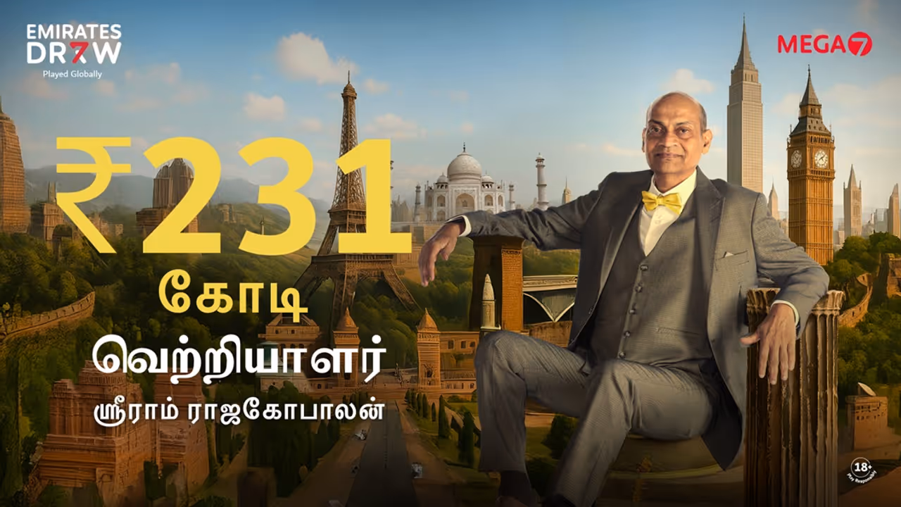 சென்னையைச் சேர்ந்த ஸ்ரீராம் ராஜகோபாலன், எமிரேட்ஸ் டிராவில் ரூ. 231 கோடி ஜாக்பாட்டை வென்றார். ஓய்வுபெற்ற பொறியாளரான இவர், தனது தாயின் பிறந்தநாளுக்குப் பிறகு டிக்கெட் வாங்கி இந்த அதிர்ஷ்டத்தைப் பெற்றார்.