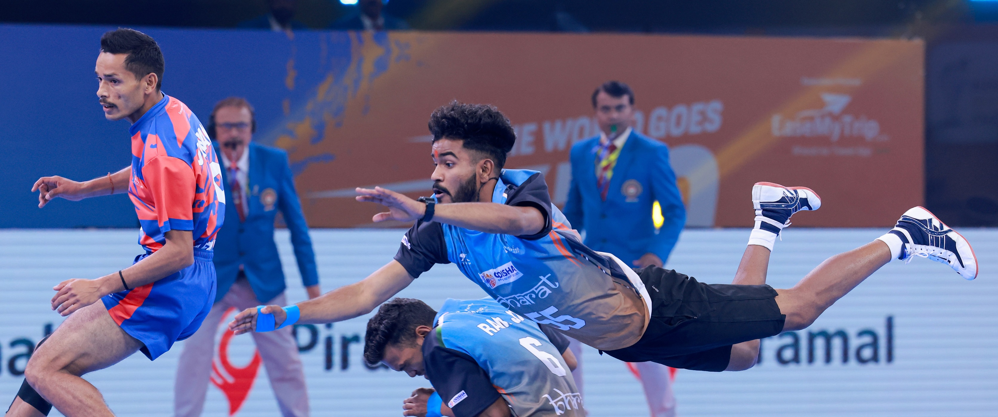 முதல் சுற்றில் ராம்ஜி காஷ்யப்பின் ஸ்கை டைவ் செய்து நேபாளத்தின் சூரஜ் புஜாராவைப் வீழ்த்தினார். பின்னர் சுயாஷ் கார்கேட் பாரத் சாஹுவைத் தொட்டு, 4 நிமிடங்களில் 10 புள்ளிகள் என்ற சிறந்த தொடக்கத்தை அளித்தார். இது முதல் சுற்றில் இந்திய அணிக்கு பிரகாசமான தொடக்கத்தை உறுதி செய்தது. இதனால், முதல் சுற்றின் முடிவில் இந்திய அணியின் ஸ்கோர் லைன் 26-0 என இருந்தது. வெற்றியை நோக்கி சரியான தொடக்கமாகவும் அமைந்தது.