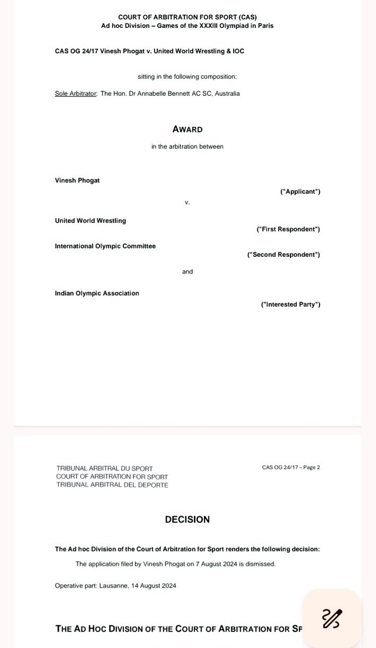 வினேஷ் போகத் தகுதிநீக்கம் செய்யப்பட்டதை எதிர்த்து கடந்த 7 ஆம் தேதி விளையாட்டு தீர்ப்பாயத்தில் மேல் முறையீடு செய்தார். அந்த மனு மீதான விசாரணை நடைபெற்று வந்த நிலையில், கடந்த 10 ஆம் தேதி இரவு 9.30 மணிக்கு தீர்ப்பு அறிவிக்கப்பட இருந்தது. ஆனால் இறுதியில் அந்த வழக்கின் தீர்ப்பு ஆகஸ்ட் 13-ந் தேதிக்கு ஒத்தி வைக்கப்பட்டது. இதைத் தொடர்ந்து மீண்டும் 3ஆவது முறையாக 16ஆம் தேதிக்கு தீர்ப்பு ஒத்தி வைக்கப்பட்டது.