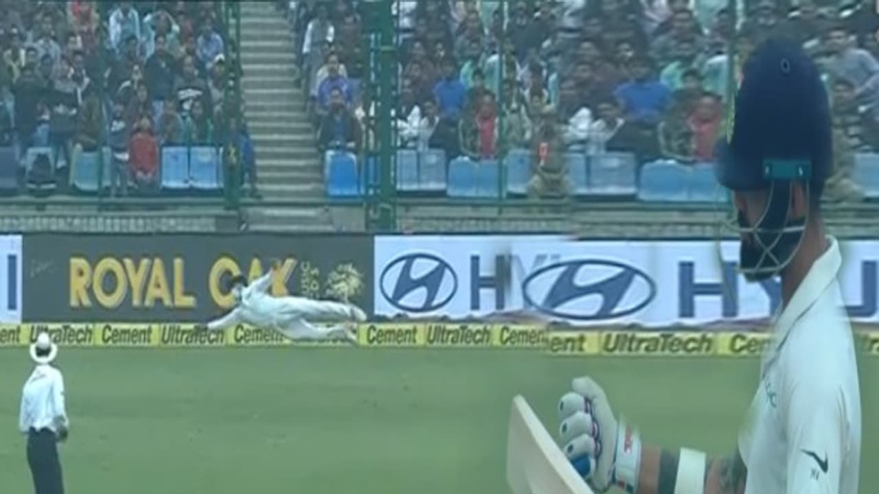 இந்திய அணியின் இரண்டாவது இன்னிங்சில் 47வது ஓவரின் இரண்டாவது பந்தில் ரோஹித் சர்மா லெக் சைடில் தூக்கி அடித்த பந்தை, காற்றில் பறந்து கேட்ச் செய்ய முயன்ற லக்மலின் கையில் இருந்து பந்து தப்பியது. எனினும் அவரது முயற்சியை மைதானமே கைதட்டி பாராட்டியது.