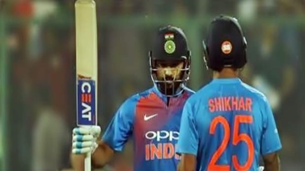 இருவருமே அரைசதம் கடந்தனர். இந்த இணை முதல் விக்கெட்டுக்கு 158 ஓட்டங்கள் சேர்த்த நிலையில் ஷிகர் தவன் 80 ஓட்டங்களுக்கு ஆட்டமிழந்தார். அவர் 10 பவுண்டரிகள், 2 சிக்ஸர்களை விளாசியிருந்தார்.