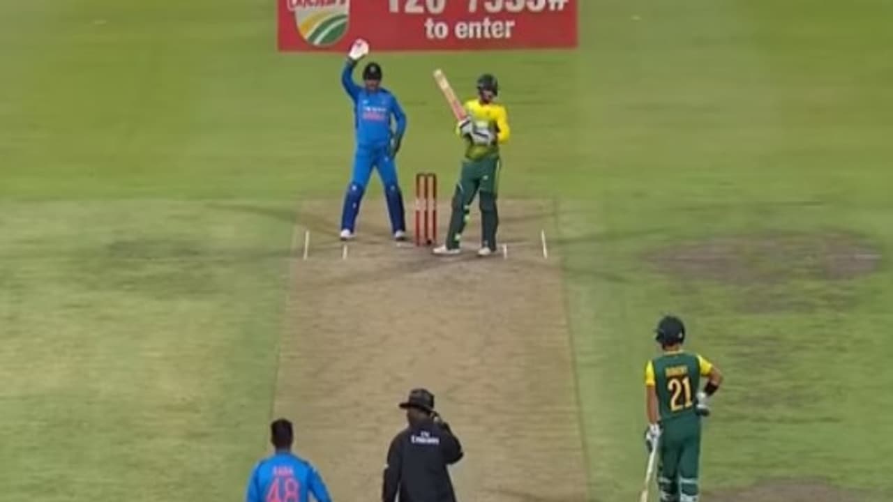14-வது ஓவரை சுரேஷ் ரெய்னா வீசினார். ரெய்னா வீசிய முதல் 3 பந்துகளில் 3 ரன்கள் சென்றுவிட்டன. அடுத்த பந்துகளில் ரன்களை கட்டுப்படுத்த வேண்டும் என்பதற்காக தோனி அவரிடம் ஆலோசனை கூறினார். அக்சர் படேல் வீசிய முதல் ஓவரில் ஏற்கெனவே 16 ரன்கள் சென்றுவிட்டதால் இந்திய அணி ரன்களை கட்டுப்படுத்த வேண்டிய நெருக்கடியில் இருந்தது.