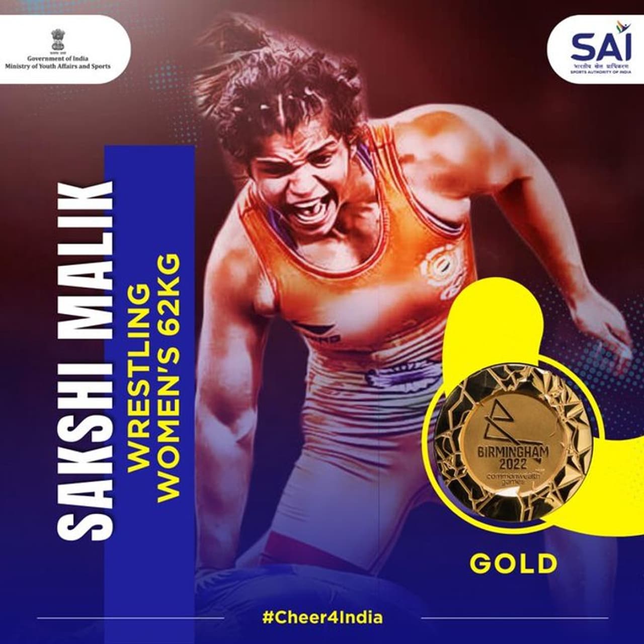 பிர்மிங்ஹாமில் நடந்து வரும் காமென்வெல்த் விளையாட்டுப் போட்டியில் மல்யுத்தப் பிரிவில் 62கிலோ ப்ரீஸ்டைல்பிரிவில் இந்திய வீராங்கனை சாக்ஷி மாலிக் முதன்முறையாக தங்கப்பதக்கம் வென்றார்