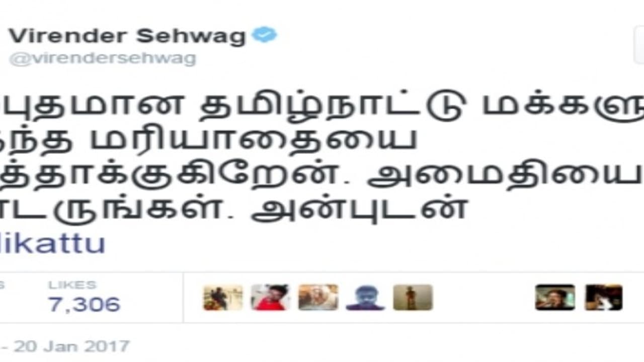 அவர் கூறியதாவது: “அற்புதமான தமிழ்நாட்டு மக்களுக்கு மிகுந்த மரியாதையை உரித்தாக்குகிறேன். அமைதியைத் தொடருங்கள். அன்புடன்” என்று சேவாக் டிவிட் செய்துள்ளார்.
