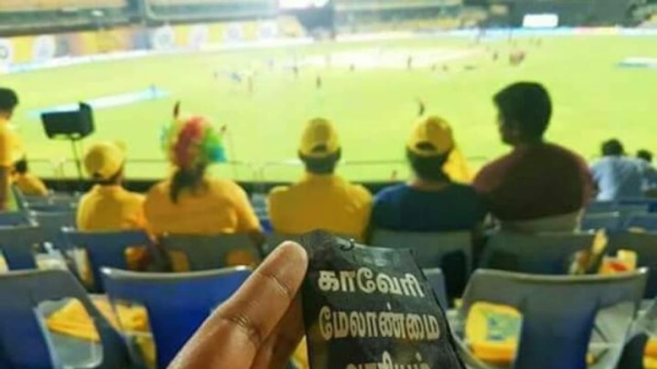 இது ஒரு பக்கம் இருக்க, தமிழக ரசிகர்கள் ஆர்வமாக விளையாட்டை மைதானத்திற்குள் அமர்ந்து பார்த்து ரசித்து வந்தாலும், அவர்களில் பல ரசிகர்கள் காவிரி மேலாண்மை வாரியம் அமைக்க வேண்டும் என வலியுறுத்தி பேட்ச் அணிந்து உள்ளனர்