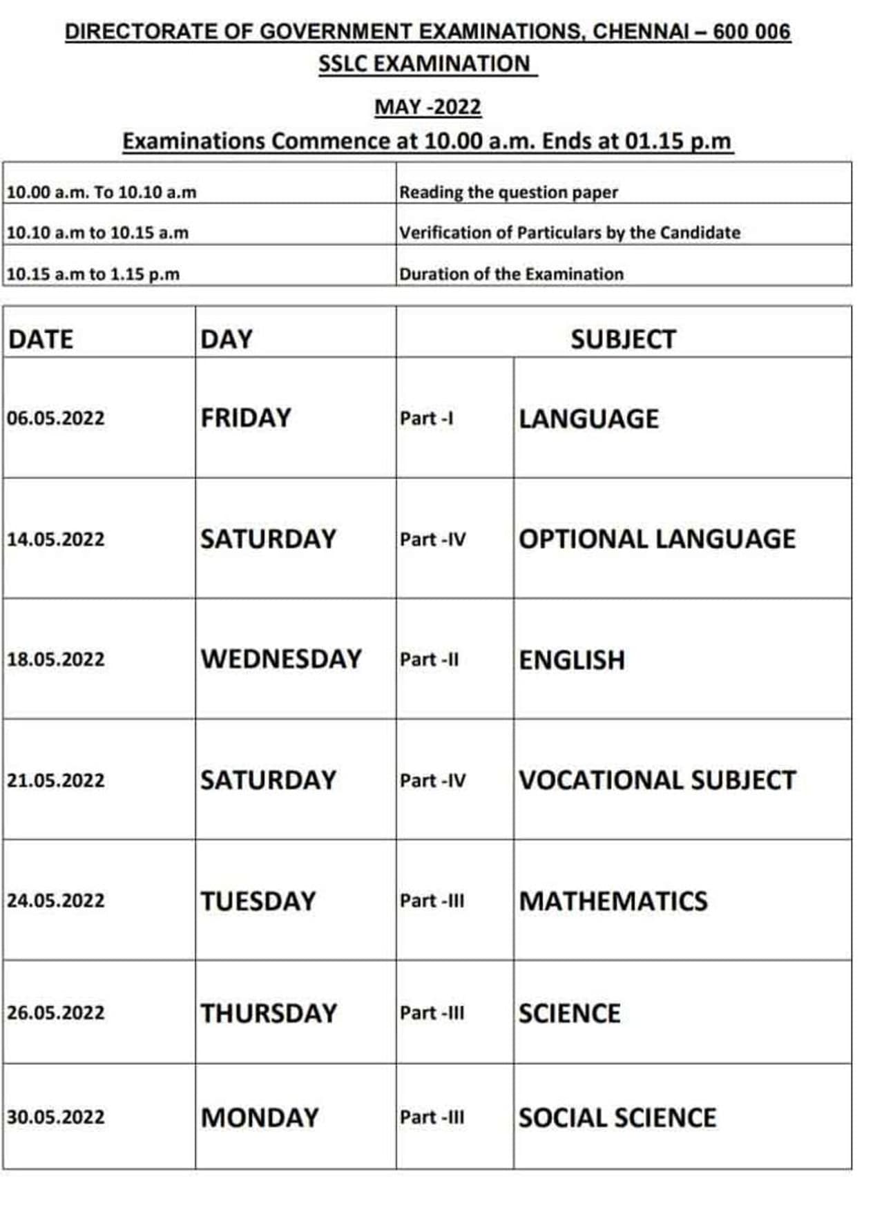 10ம் வகுப்பு பொதுத்தேர்வு கால அட்டவணை விவரம்;-
