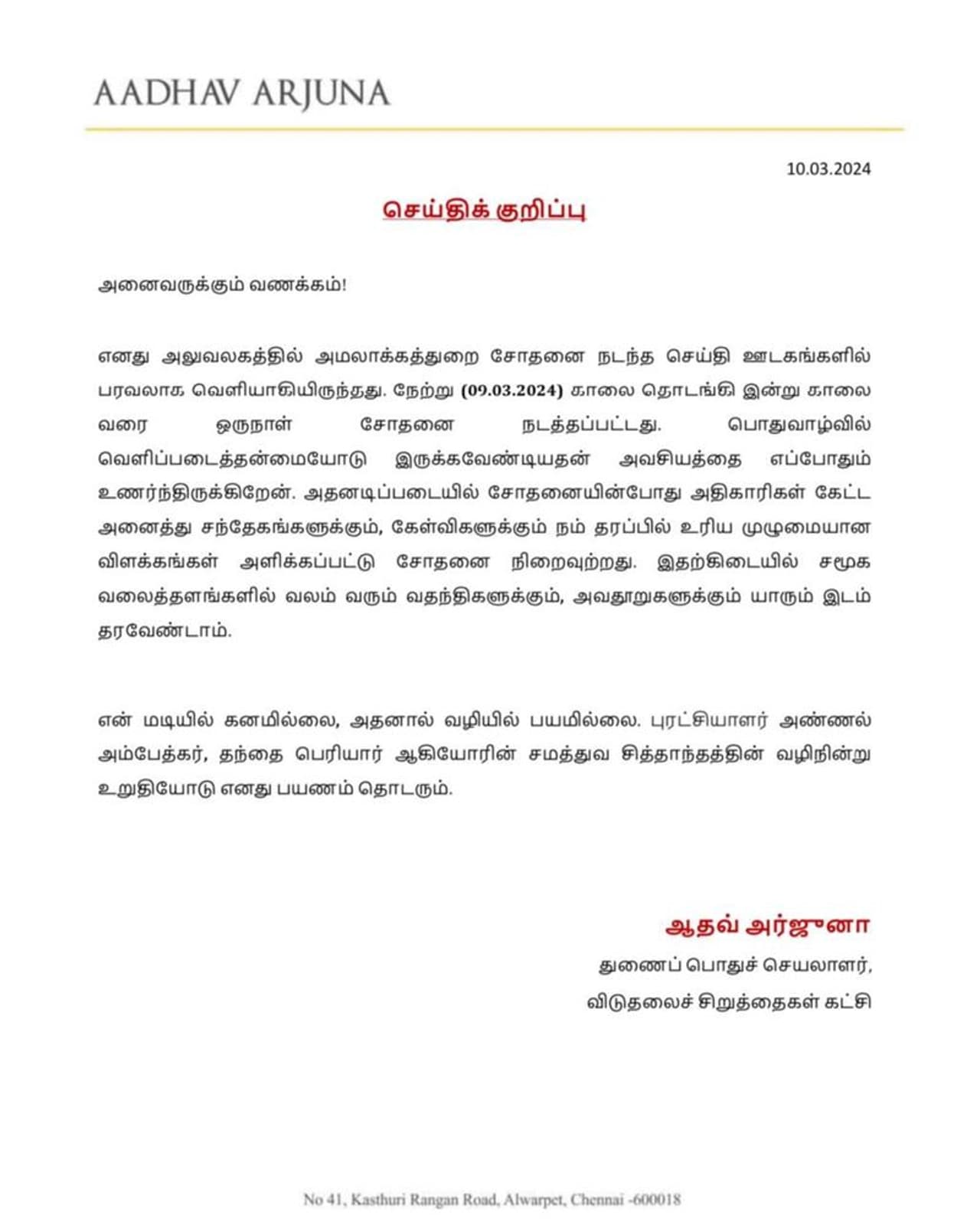 இது தொடர்பாக விடுதலை சிறுத்தைகள் கட்சி துணைப்பொதுச்செயலாளர் ஆதவ் அர்ஜூனா வெளியிட்டுள்ள அறிக்கையில், எனது அலுவலகத்தில் அமலாக்கத்துறை சோதனை நடந்த செய்தி ஊடகங்களில் பரவலாக வெளியாகியிருந்தது. நேற்று முன்தினம் (09.03.2024) காலை தொடங்கி நேற்று காலை வரை ஒருநாள் சோதனை நடத்தப்பட்டது. பொதுவாழ்வில் வெளிப்படைத்தன்மையோடு இருக்கவேண்டியதன் அவசியத்தை எப்போதும் உணர்ந்திருக்கிறேன். அதனடிப்படையில் சோதனையின்போது அதிகாரிகள் கேட்ட அனைத்து சந்தேகங்களுக்கும், கேள்விகளுக்கும் நம் தரப்பில் உரிய முழுமையான விளக்கங்கள் அளிக்கப்பட்டு சோதனை நிறைவுற்றது.
