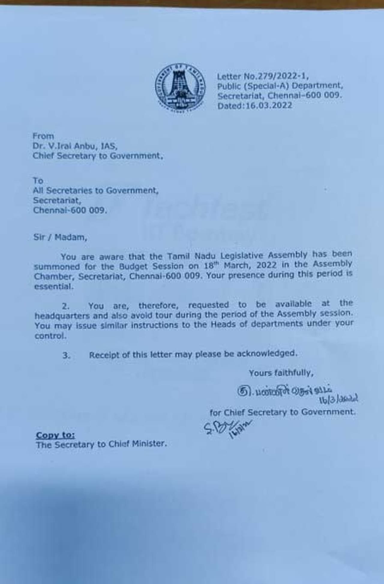 இது தொடர்பாக,அனைத்து அரசு செயலாளர்களுக்கும் இறையன்பு அனுப்பியுள்ள சுற்றறிக்கையில்;- தமிழக பட்ஜெட் கூட்டத் தொடருக்காக மார்ச் 18 (இன்று) சட்டமன்றம் கூடுகிறது என்பதை நீங்கள் அறிவீர்கள். இந்தக் காலகட்டத்தில் உங்கள் இருப்பு அவசியம். எனவே, நீங்கள் தலைமையகத்தில் இருக்குமாறும், சட்டசபை கூட்டத் தொடரின் போது சுற்றுப்பயணத்தை தவிர்க்குமாறும் கேட்டுக்கொள்ளப்படுகிறது. உங்கள் கட்டுப்பாட்டில் உள்ள துறைத் தலைவர்களுக்கு நீங்கள் இதே போன்ற அறிவுறுத்தல்களை வழங்கலாம் என்று தெரிவிக்கப்பட்டுள்ளது.