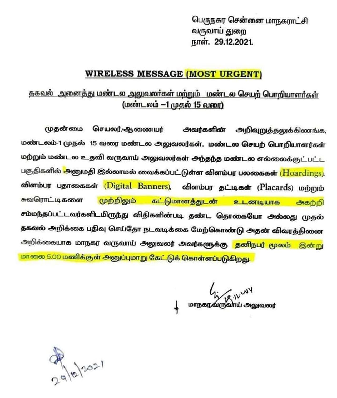 முதன்மை செயலாளர் ஆணைக்கு ஏற்ப சென்னையின் மண்டலம் 1 முதல் 15 வரை மண்டல எல்லைக்கு உட்பட்ட பகுதிகளில் அனுமதி இல்லாமல் வைக்கப்பட்டுள்ள விளம்பர பலகைகள், விளம்பர பதாகைகள், தட்டிகள், சுவரொட்டிகளை உடனடியாக கட்டுமானத்துடன் அகற்ற வேண்டும்.