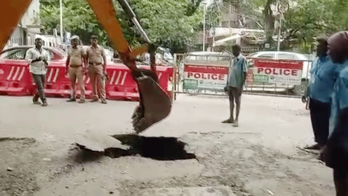 இதுதொடர்பாக உடனடியாக போக்குவரத்து காவல்துறைக்கு அப்பகுதி மக்கள் தகவல் தெரிவித்தனர். சம்பவ இடத்திற்கு விரைந்த போலீசார் பள்ளம் ஏற்பட்ட சாலையில் நின்றிருந்த அனைத்து வாகனங்களையும் மாற்று வழியில் அனுப்பி போக்குவரத்தை சரிசெய்தனர். ராட்சத பள்ளம் ஏற்பட்ட இடத்தைச் சுற்றி இரும்புத் தடுப்புகளை வைத்து விபத்து ஏற்படாத வண்ணம் நடவடிக்கை மேற்கொண்டனர்.