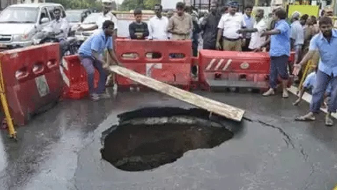 சென்னை அண்ணாநகரில் சாலையில் திடீரென 15 அடி ஆழத்தில் ராட்சத பள்ளம் ஏற்பட்டுள்ளது. இதனால் அப்பகுதியில் சுமார் ஒரு மணி நேரத்திற்கு மேலாக போக்குவரத்து பாதிக்கப்பட்டது.