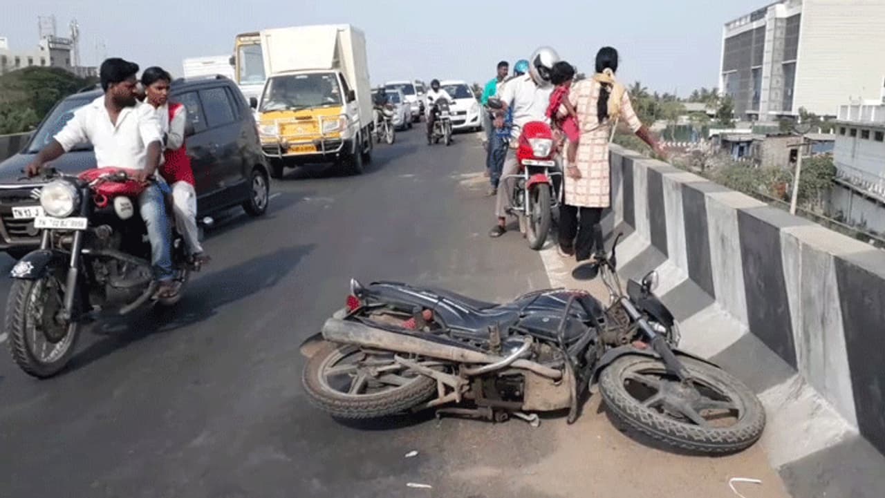 அப்போது பின்னால் வேகமாக வந்த லாரி ஒன்று உரசிச் சென்றதால் நிலைதடுமாறி இருசக்கர வாகனத்தில் இருந்த சாய்சந்தோஷ் பாலத்தில் இருந்து கீழே விழுந்தார். தந்தை சந்திரசேகர் பாலத்திலேயே கீழே விழுந்தார். மேம்பாலத்தில் இருந்து கீழே விழுந்த சாய் சந்தோஷ் படுகாயமடைந்து ரத்த வெள்ளத்தில் மயங்கிய நிலையில் கிடந்தார். இதனை கண்டு அதிர்ச்சி அடைந்த தந்தை பெற்ற மகனை மார்பில் அணைத்து கதறினார். இதனையடுத்து உடனே ஆம்புலன்ஸ் வரவழைக்கப்பட்டு தனியார் மருத்துவமனையில் அனுமதிக்கப்பட்டு அவருக்கு தீவிர சிகிச்சை அளிக்கப்பட்டு வருகிறது.