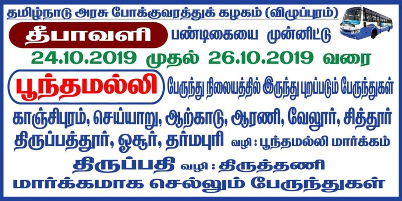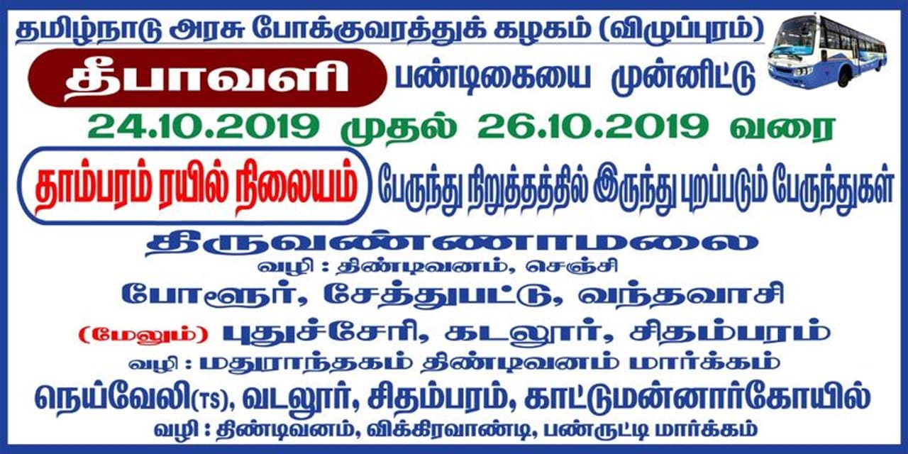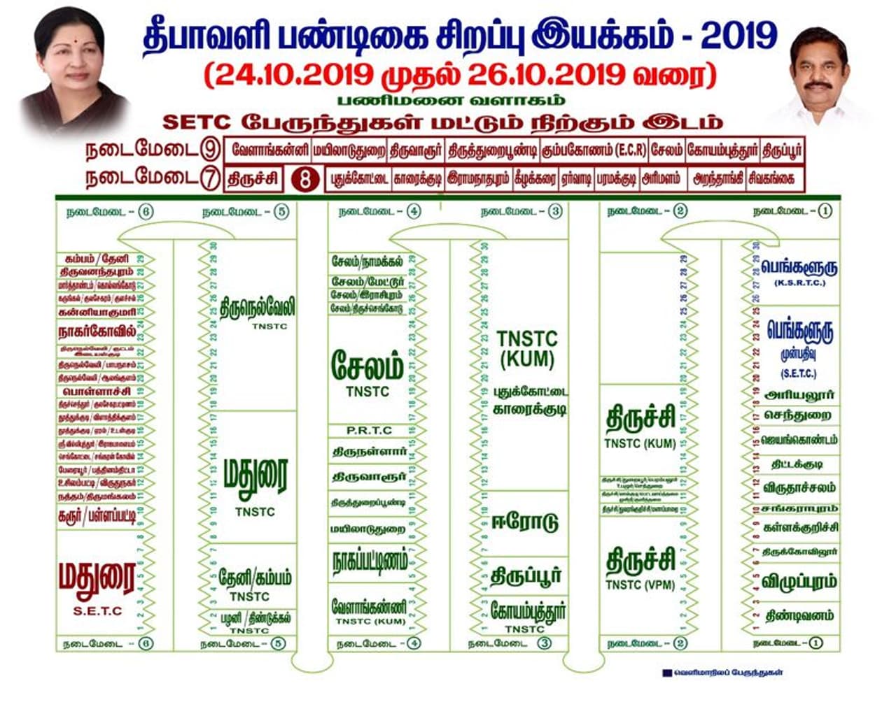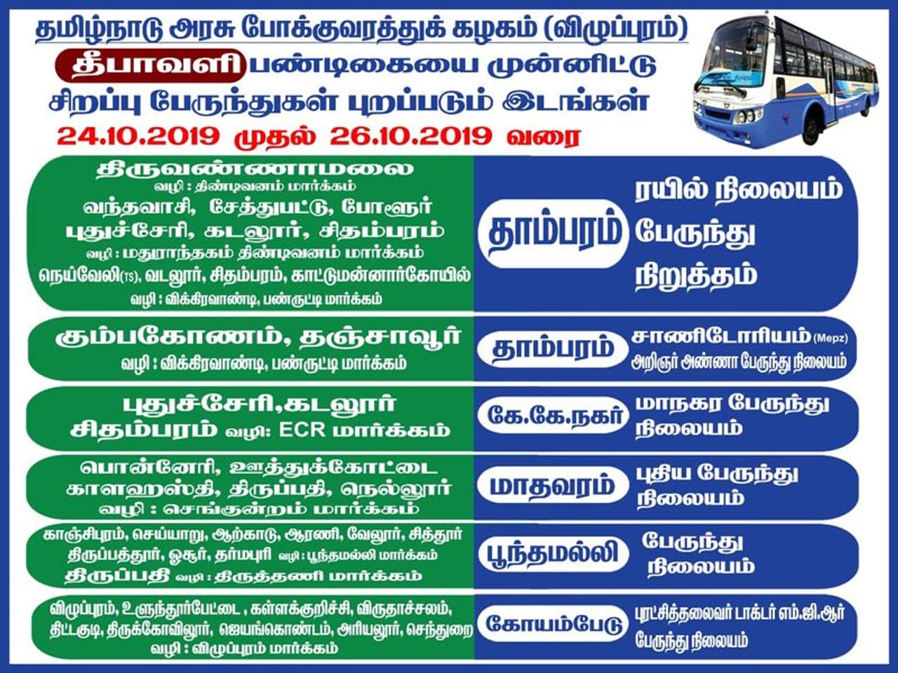 அதன் படி, அக்டோபர் 27 ஆம் தேதி, தீபாவளி திருநாள் வருவதை ஒட்டி, பயணிகள் அவரவர் ஊர்களுக்கு செல்லும் பேருந்துகள் எந்த பேருந்து நிறுத்தத்தில் இருந்து செல்கிறது என்பது அறிவிக்கப்பட்டுள்ளது. மேலும் 24 ஆம் தேதி முதல் 26 ஆம் தேதி வரை சிறப்பு பேருந்துகள் இயக்கப்படும் என தெரிவிக்கப்பட்டுள்ளது.