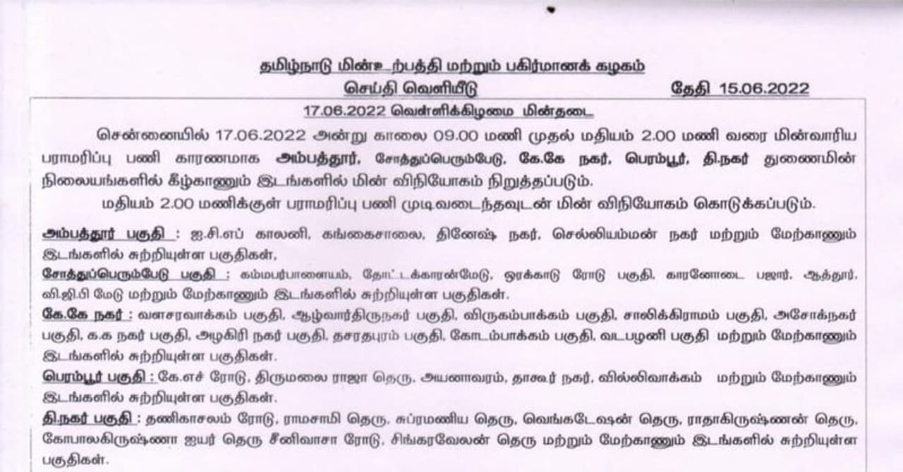 தி.நகர் பகுதி : தணிகாசலம் ரோடு, ராமசாமி தெரு, சுப்ரமணிய தெரு, வெங்கடேஷன் தெரு, ராதாகிருஷ்ணன் தெரு, கோபாலகிருஷ்ணா ஐயர் தெரு சீனிவாசா ரோடு, சிங்கரவேலன் தெரு மற்றும் மேற்காணும் இடங்களில் சுற்றியுள்ள பகுதிகள் காலை 10 மணி முதல் மதியம் 2 மணி வரை மின்தடை ஏற்படும் என தெரிவிக்கப்பட்டுள்ளது.