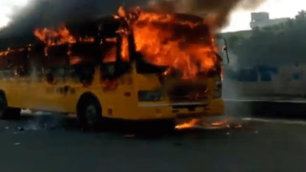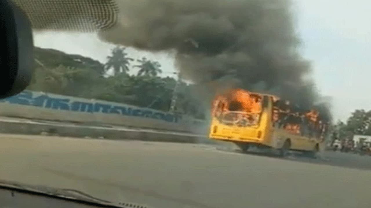 இது தொடர்பாக உடனே தீயணைப்புத்துறைக்கு தகவல் தெரிவிக்கப்பட்டது. சம்பவ இடத்திற்கு விரைந்த தீயணைப்பு வீரர்கள் தீயை அணைக்கும் பணியில் தீவிரமாக ஈடுபட்டுள்ளனர். பேருந்து தீ விபத்தால் அப்பகுதி முழுவதும் புகை மண்டலமாக காட்சியளிக்கிறது. இதனால் கடும் போக்குவரத்து நெரிசல் ஏற்பட்டுள்ளது. இது தொடர்பாக போலீசார் வழக்குப்பதிவு செய்து விசாரணை நடத்தி வருகின்றனர்.
