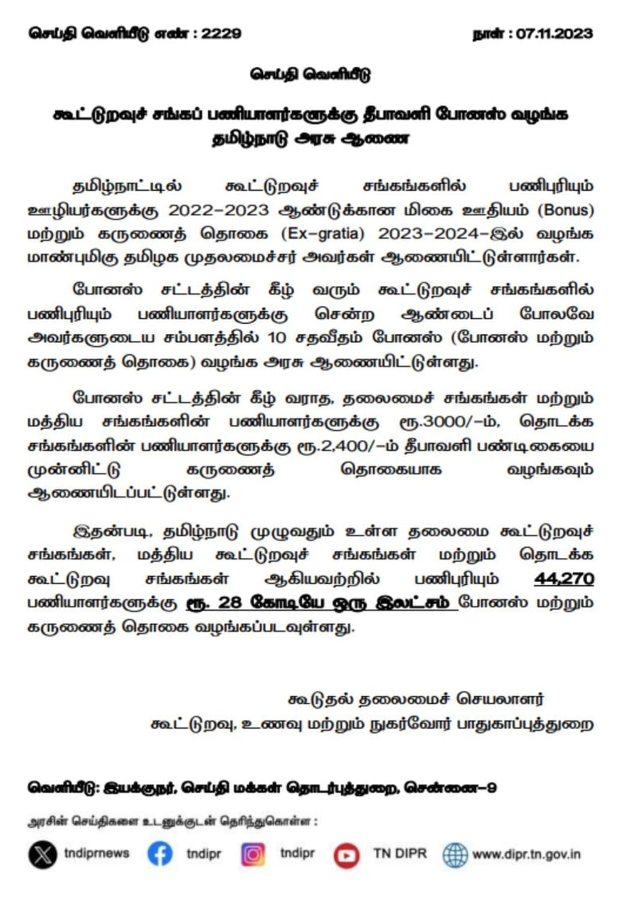 இதன்படி, தமிழ்நாடு முழுவதும் உள்ள தலைமை கூட்டுறவுச் சங்கங்கள், மத்திய கூட்டுறவுச் சங்கங்கள் மற்றும் தொடக்க கூட்டுறவு சங்கங்கள் ஆகியவற்றில் பணிபுரியும் 44,270 பணியாளர்களுக்கு ரூ. 28 கோடியே ஒரு இலட்சம் போனஸ் மற்றும் கருணைத் தொகை வழங்கப்படவுள்ளது” என்று தெரிவித்துள்ளது.