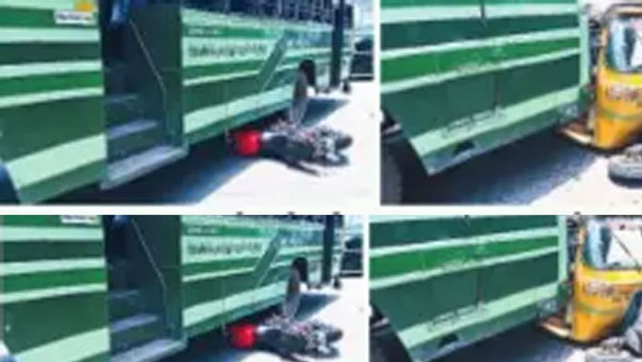 சென்னை கோயம்பேட்டில் புறநகர் பேருந்து நிலையத்தில் அரசு பேருந்து சக்கரத்தில் சிக்கிய கல்லூரி மாணவன் அதிர்ஷ்டவசமாக உயிர் தப்பினார். அவரது உயிரை ஆட்டோ காப்பாற்றியுள்ளார்.