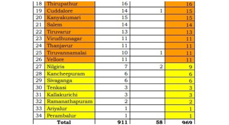 தமிழகத்தில் கொரோனா வைரஸின் தாக்கம் நாள்தோறும் அதிகரித்துவருகிறது. இன்று மட்டும் தமிழகத்தில் 58 பேர் கொரோனா வைரஸ் பாதிப்புக்கு ஆளாகியுள்ளனர். இதனால் கொரோனா வைரஸால் பாதிக்கப்பட்டவர்களின் எண்ணிக்கை 969 ஆக அதிகரித்துள்ளது. இந்நிலையில் தமிழகத்தில் கொரோனா வைரஸால் பாதிக்கப்பட்ட மாவட்டங்களை மூன்று வண்ணங்களில் பிரித்துள்ளது தமிழக அரசு.