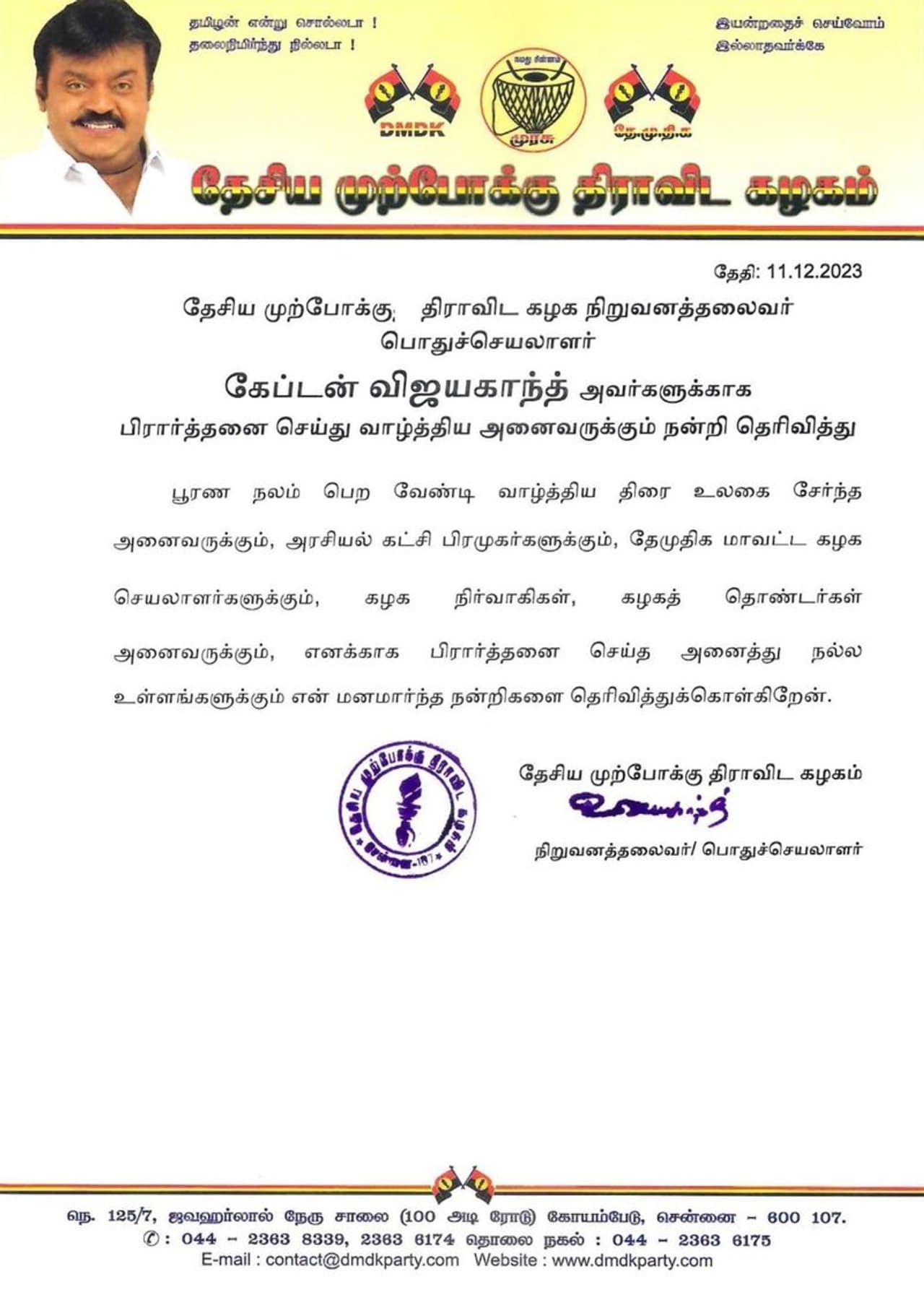 இந்த நிலையில் தேமுதிக தலைவரும், நடிகருமான விஜயகாந்த் வெளியிட்டுள்ள அறிக்கையில், “பூரண நலம் பெற வேண்டி வாழ்த்திய திரை உலகை சேர்ந்த அனைவருக்கும், அரசியல் கட்சி பிரமுகர்களுக்கும், தேமுதிக மாவட்ட கழக செயலாளர்களுக்கும், கழக நிர்வாகிகள், கழகத் தொண்டர்கள் அனைவருக்கும், எனக்காக பிரார்த்தனை செய்த அனைத்து நல்ல உள்ளங்களுக்கும் என் மனமார்ந்த நன்றிகளை தெரிவித்துக்கொள்கிறேன்” எனக் குறிப்பிட்டுள்ளார்.