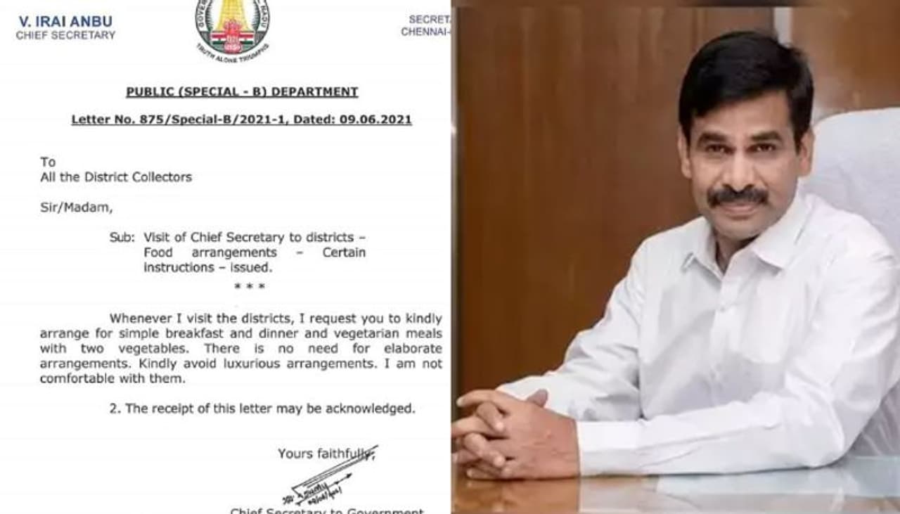 ஆய்விற்காக மாவட்டங்களுக்கு வரும்போது ஆடம்பர உணவு ஏற்பாடுகளை தவிர்த்திடுமாறு தலைமை செயலாளர் இறையன்பு மாவட்ட ஆட்சியர்களுக்கு உத்தரவிட்டுள்ளார்