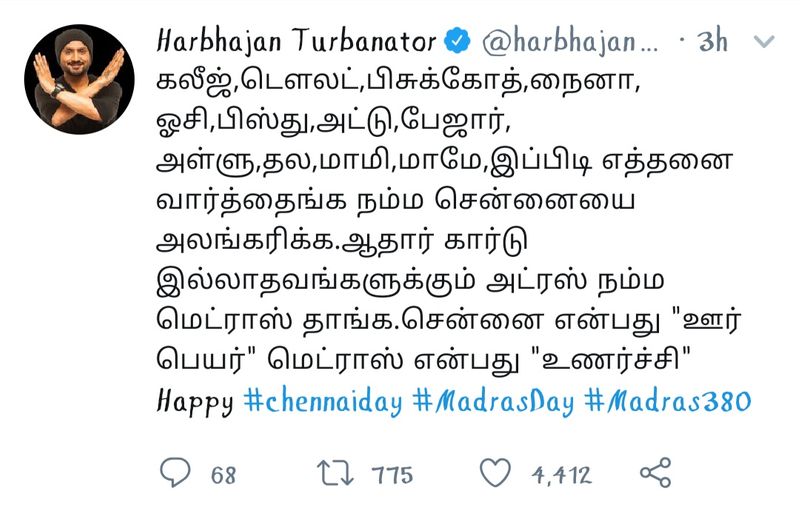 சென்னை சூப்பர் கிங்ஸ் அணியில் விளையாடும் ஹர்பஜன் சிங் தமிழகத்தோடு மிகவும் ஒன்றிப் போனவர் . தமிழ்நாட்டில் கொண்டாடப் படும் முக்கிய விழாக்களுக்கு தமிழில் வாழ்த்துச் செய்தி பதிவு செய்வார். அந்த வகையில் சென்னை தினத்திற்கு வாழ்த்தியுள்ளார் . அதில் அவர் கூறியிருப்பது :