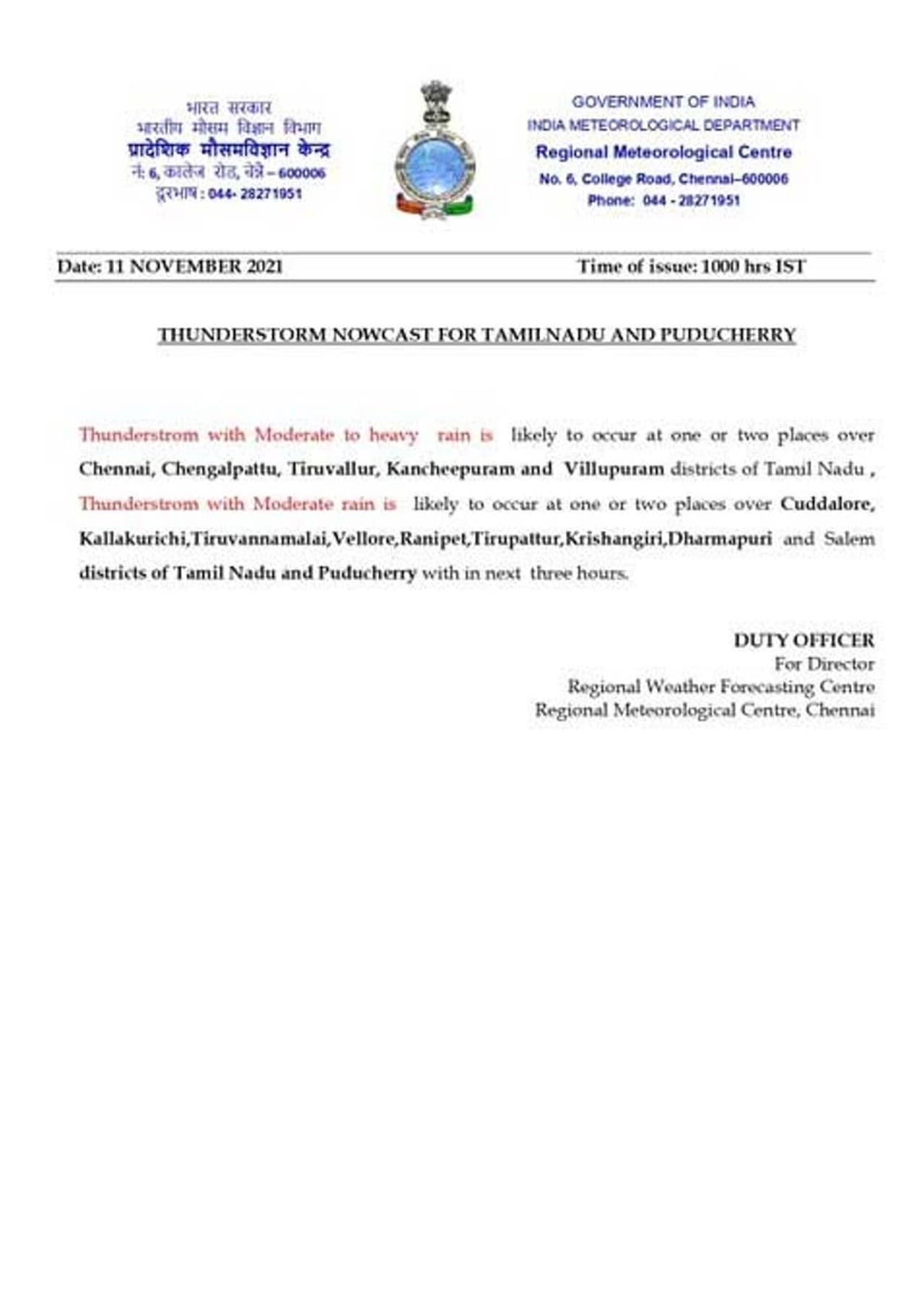 அடுத்த 3 மணி நேரத்தில் தமிழகத்தின் திருவள்ளூர், சென்னை, செங்கல்பட்டு, விழுப்புரம் மற்றும் காஞ்சிபுரம் மாவட்டங்களில் ஓரிரு இடங்களில் இடியுடன் கூடிய கனமழையும் மிக கனமழை பெய்ய வாய்ப்புள்ளது என வானிலை மையம் தெரிவித்துள்ளது.