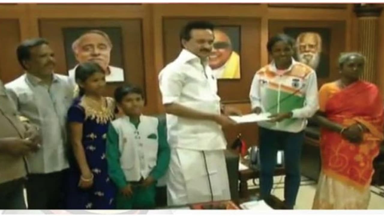 ஆசிய தடகள சாம்பியன்ஷிப் போட்டியில் தங்கம் வென்ற கோமதி மாரிமுத்துவுக்கு திமுக தலைவர் மு.க.ஸ்டாலின் 10 லட்சம் ரூபாய்க்கான காசோலையைப் பரிசாக வழங்கினார்.