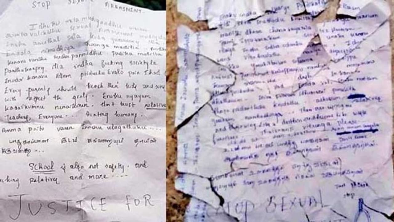 இதற்கு மேல் பாலியல் துன்புறுத்தல்களை தடுக்க வேண்டும். இதுக்கு மேல முடியாது. மனசு ரொம்ப வலிக்குது. எனக்கு ஆறுதல் சொல்லக் கூட யாரும் இல்லை. என்னால நிம்மதியா தூங்க முடியல. கனவு வந்து டார்ச்சர் பண்ணுது. படிக்க முடியலை. இந்த சமூகத்துல பாதுகாப்பே இல்லை. என்னோட கனவு எல்லாம் போயிடுச்சு. பெண்களை எப்படி மதிக்க வேண்டும் என்று அனைத்து பெற்றோர்களும் தங்கள் மகன்களுக்கு சொல்லிக் கொடுங்கள். எனக்கு நியாயம் கிடைக்கும்னு நினைக்கிறேன். உறவினர்கள், ஆசிரியர்கள் யாரையும் நம்பாதீர்கள். அனைத்து மனிதர்களும் வேட்டையாடுபவர்கள் தான். அம்மா போய்ட்டு வர்றேன் இன்னொரு உலகத்துக்கு பாதுகாப்பான இடம் கல்லறையும், தாயின் கருவறையும்தான். பள்ளிக்கூடங்கள் பாதுகாப்பான இடம் இல்லை. எனக்கு நியாயம் கிடைக்க வேண்டும் என மாணவி எழுதிய 2 பக்க கடிதத்தில் எழுதப்பட்டுள்ளது.