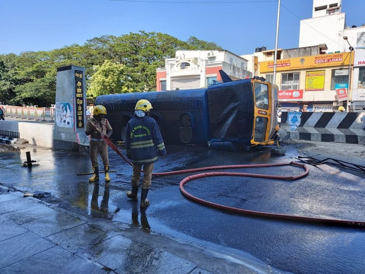 சென்னை அண்ணாசாலையில் சென்றுகொண்டிருந்தபோது, ஜெமினி மேம்பாலத்தில் ஏறி இறங்கியபோது, தடுப்புச்சுவரில் மோதி கவிழ்ந்து விபத்துக்குள்ளானது. ஓட்டுநர் முருகன் நூலிழையில் உயிர் தப்பினார். ஆனால் அந்த லாரியில் இருந்த 24 ஆயிரம் லிட்டர் பாமாயில் சாலையில் ஊற்றி வீணானது. கீழே ஊற்றிய பாமாயில் வெள்ளம்போல் ஓடியது. அதன்மீது தீயணைப்புத்துறையினர் தண்ணீரை பீய்ச்சியடித்தனர். இதுகுறித்து தேனாம்பேட்டை போலீஸார் வழக்குப்பதிவு செய்து விசாரித்துவருகின்றனர்.