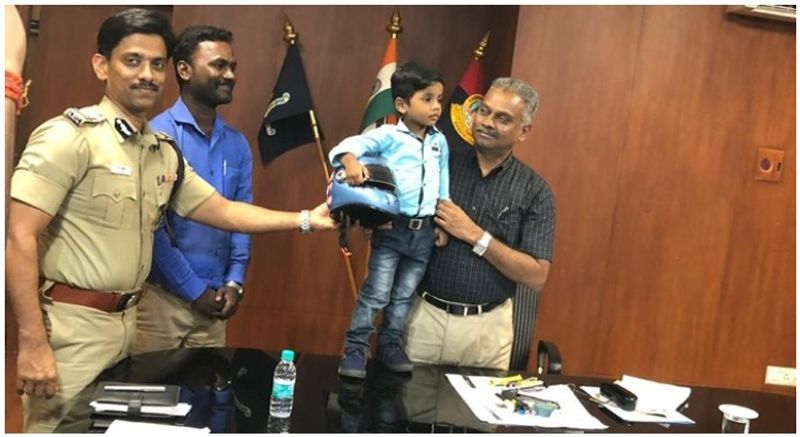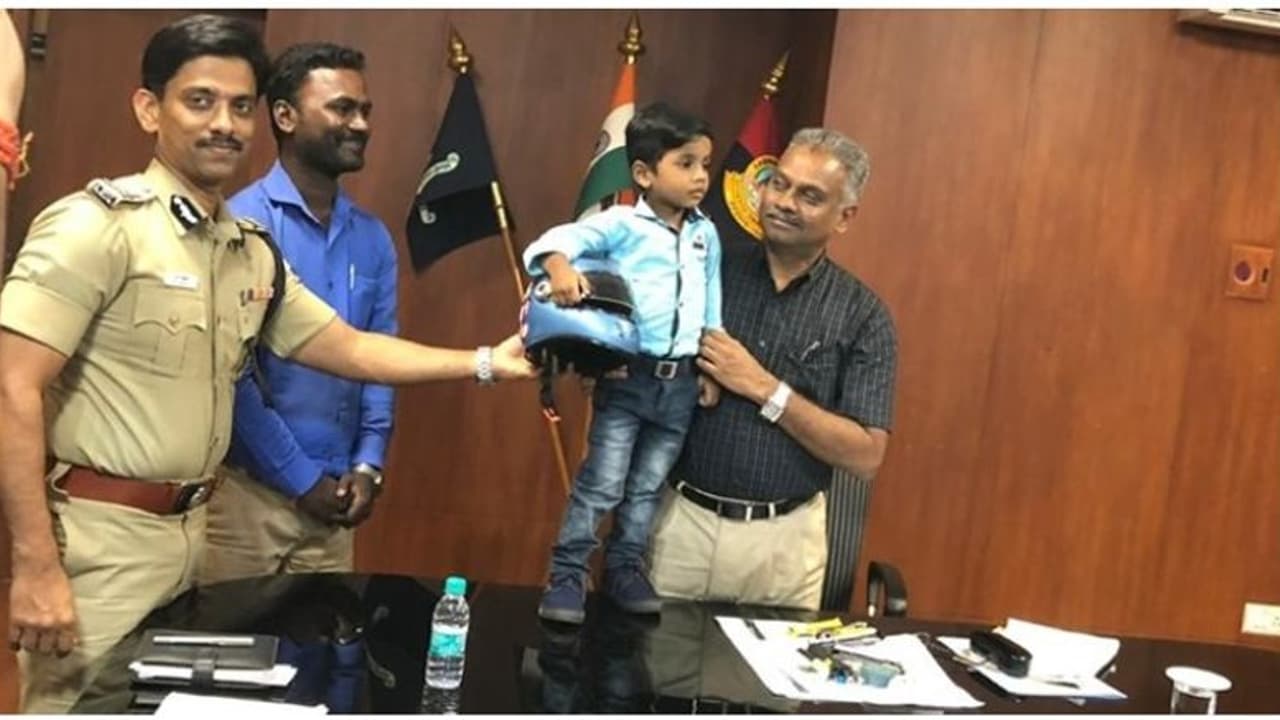 தந்தையோடு இரு சக்கர வாகனத்தில் ஹெல்மெட் அணிந்து பயணித்த சிறுவனை சென்னை மாநகர காவல் ஆணையர் விஸ்வநாதன் நேரில் அழைத்து பாராட்டினார்.