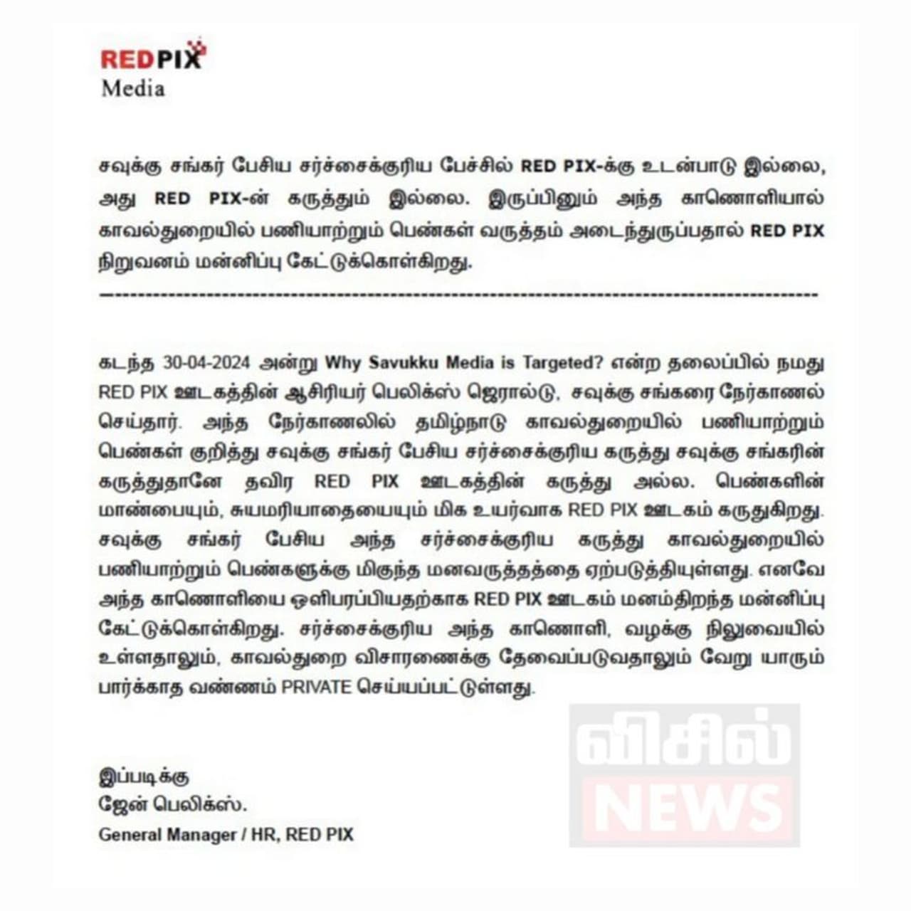 பெண்களின் மாண்பையும், சுயமரியாதையையும் மிக உயர்வாக RED PIX ஊடகம் கருதுகிறது. சவுக்கு சங்கர் பேசிய அந்த சர்ச்சைக்குரிய கருத்து காவல்துறையில் பணியாற்றும் பெண்களுக்கு மிகுந்த மனவருத்தத்தை ஏற்படுத்தியுள்ளது. எனவே அந்த காணொளியை ஒளிபரப்பியதற்காக RED PIX ஊடகம் மனம்திறந்த மன்னிப்பு கேட்டுக்கொள்கிறது.
