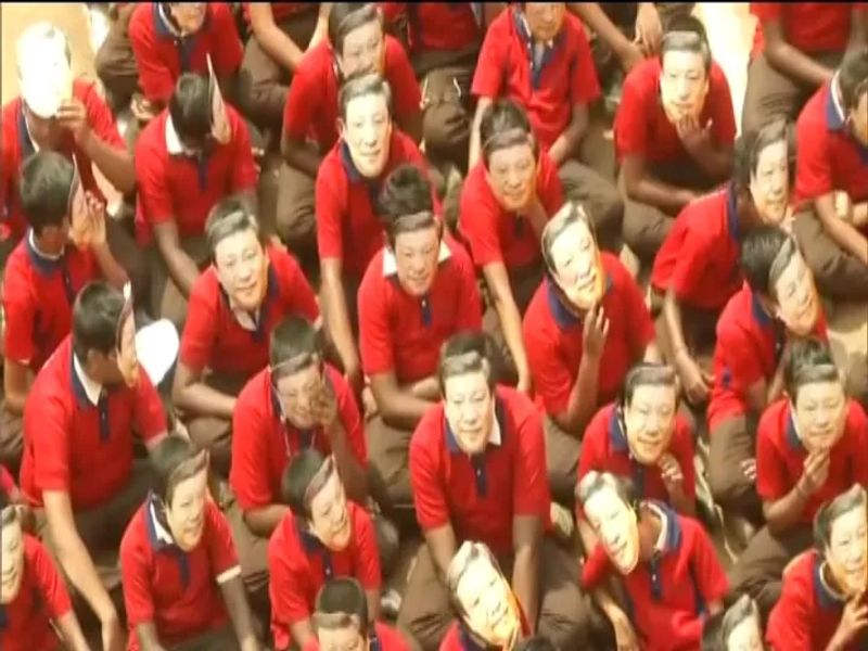 அதன்படி சீனாவின் தாய்மொழியான மாண்டரின் மொழியில் சீன அதிபரின் பெயரான ஜின்பிங் வடிவில் 2000 மாணவர்கள் ஒன்றாக அமர்ந்து அவருக்கு சிறப்பான வரவேற்பு அளித்தனர். மேலும் ஜின்பிங் முகமூடி மற்றும் சிவப்பு உடையை அணிந்து கொண்டு மாணவர்கள் உற்சாகமாக காட்சியளித்தனர்.