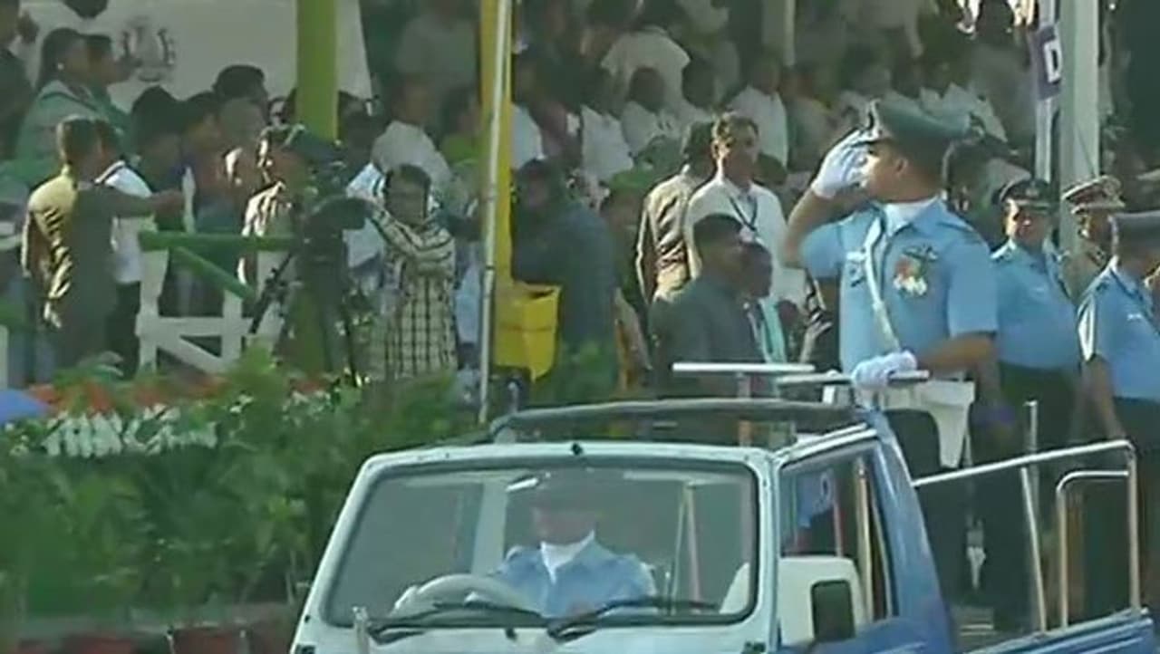 இதைத்தொடர்ந்து, ஆளுநர் விழா நடக்கும் இடத்திற்கு வருகை தந்தார். முதல்வர் எடப்பாடி பழனிசாமி, துணை முதல்வர் ஓ.பன்னீர் செல்வம் மற்றும் தலைமைச் செயலாளர் ஆகியோர் ஆளுநரை வரவேற்றனர். இதையடுத்து, ஆளுநர் பன்வாரிலால் புரோகித் தேசியக் கொடியை ஏற்றிவைத்தார். அதன்பின், அவர் முப்படை வீரர்களின் அணிவகுப்பு மரியாதையை ஏற்றுக்கொண்டார். பல்வேறு துறைகளின் சார்பில் இடம்பெற்றுள்ள கண்காட்சி அணிவகுப்பையும் அவர் பார்வையிட்டு வருகிறார்.