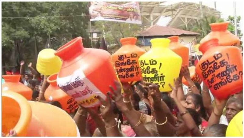 தமிழகத்தில் ஏற்பட்டுள்ள தண்ணீர் பிரச்சனையை கண்டித்து, குடிநீர் பஞ்சத்தை போக்க வலியுறுத்தியும் திமுக சார்பில், மு.க.ஸ்டாலின் தலைமையில் இன்று சென்னை சேப்பாக்கம் விருந்தினர் மாளிகை முன்பு கண்டன ஆர்ப்பாட்டம் நடந்தது.