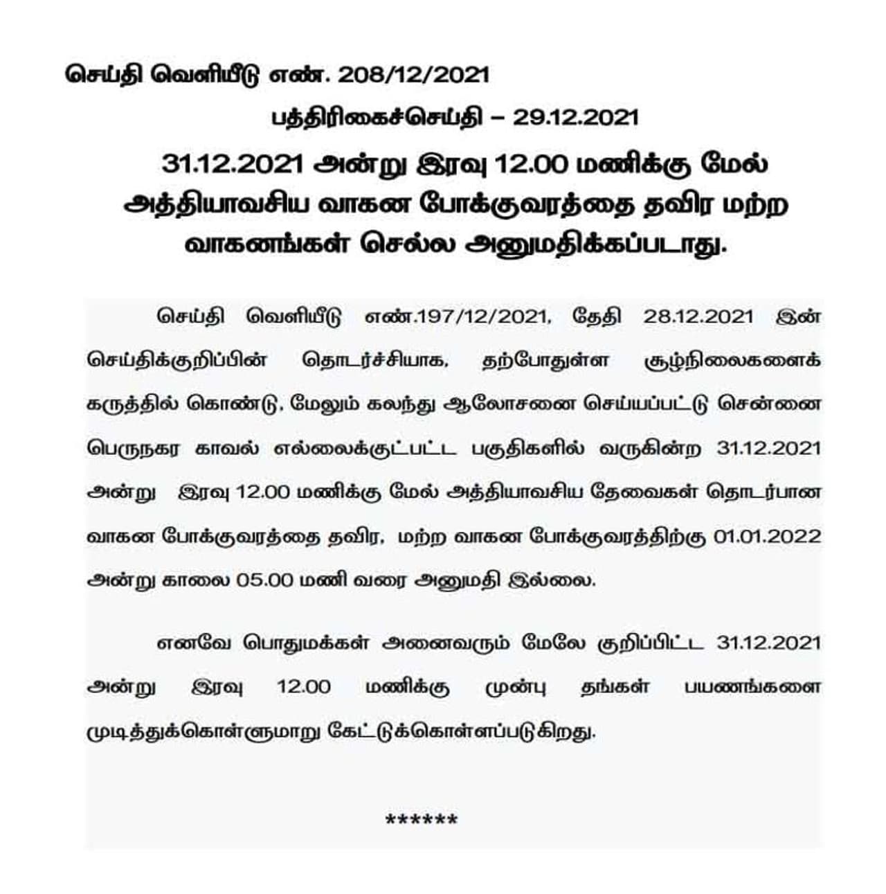 இந்நிலையில், சென்னை பெருநகர காவல் எல்லைக்கு உட்பட்ட பகுதிகளில் நாளை இரவு 12 மணி முதல் ஒன்றாம் தேதி காலை 5 மணி வரை, அத்தியாவசிய வாகன போக்குவரத்திற்கு மட்டுமே அனுமதி அளிக்கப்படும் எனத் தெரிவிக்கப்பட்டுள்ளது. இந்த நேரத்தில் மற்ற வாகனங்கள் செல்ல அனுமதிக்கப்படாது என்று சென்னை காவல்துறை திட்டவட்டமாக அறிவித்துள்ளது. ஆகவே பொதுமக்கள் அனைவரும் நாளை இரவு 12 மணிக்கு முன்பாகவே தங்கள் பயணங்களை முடித்துக்கொள்ளுமாறு காவல்துறை கேட்டுக்கொண்டுள்ளது.