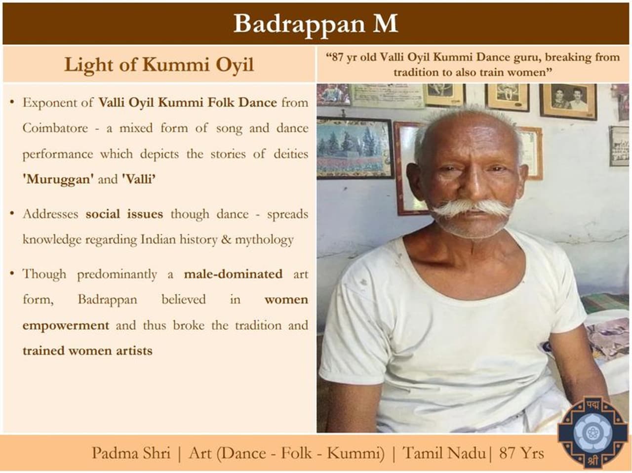 தமிழ்நாட்டைச் சேர்ந்த 87 வயதான வள்ளி ஒயில் கும்மி ஆட்டக் கலைஞர் பத்திரப்பன் நாளை டெல்லியில் நடைபெறும் குடியரசு தின விழாவில் பத்மஶ்ரீ விருது பெற இருக்கிறார்.