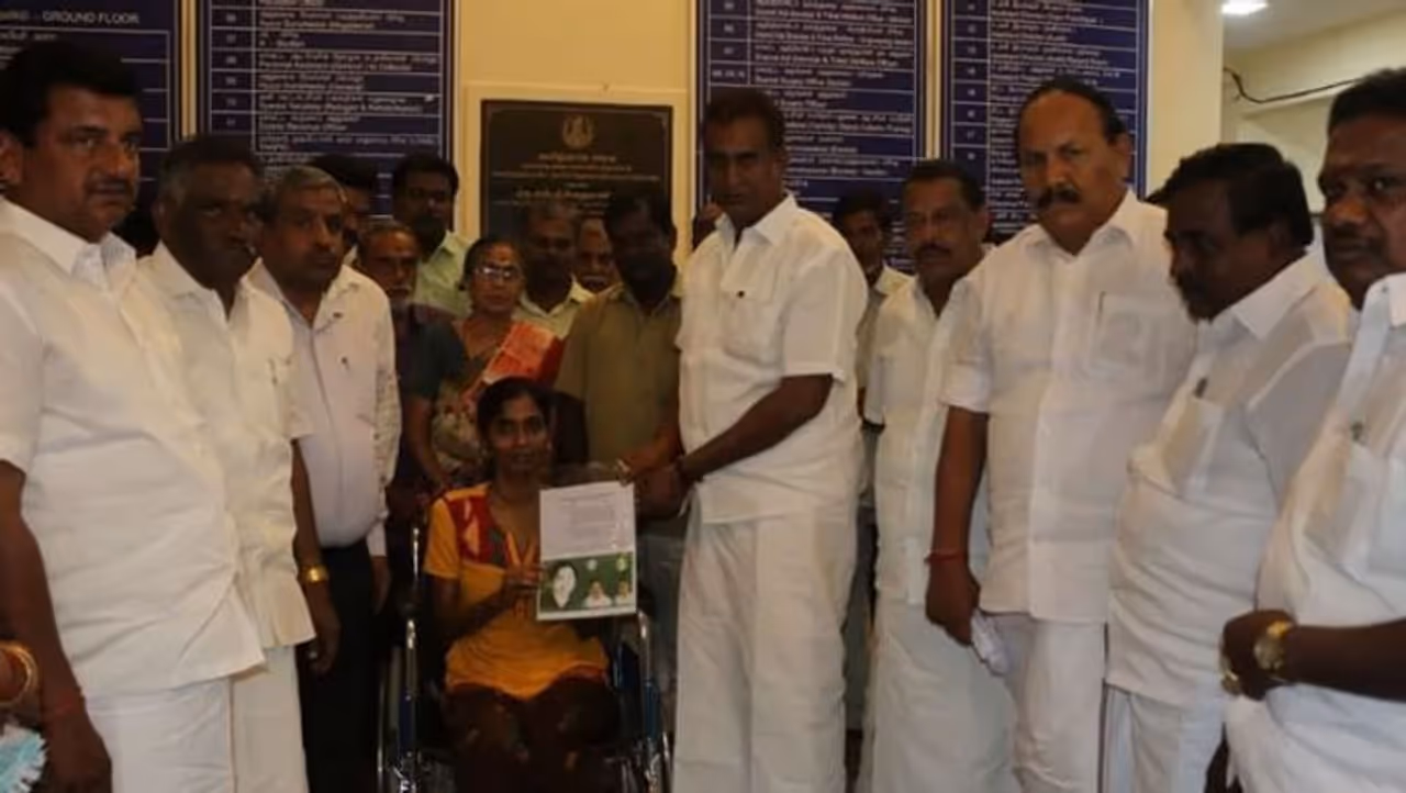 கோவையில் அதிமுக கொடிக்கம்பம் சாய்ந்து ஏற்பட்ட விபத்தில் இடது காலை இழந்த பெண்ணணுக்கு அரசு வேலைக்கான ஆணையை உள்ளாட்சித்துறை அமைச்சர் எஸ்.பி.வேலுமணி வழங்கினார்.