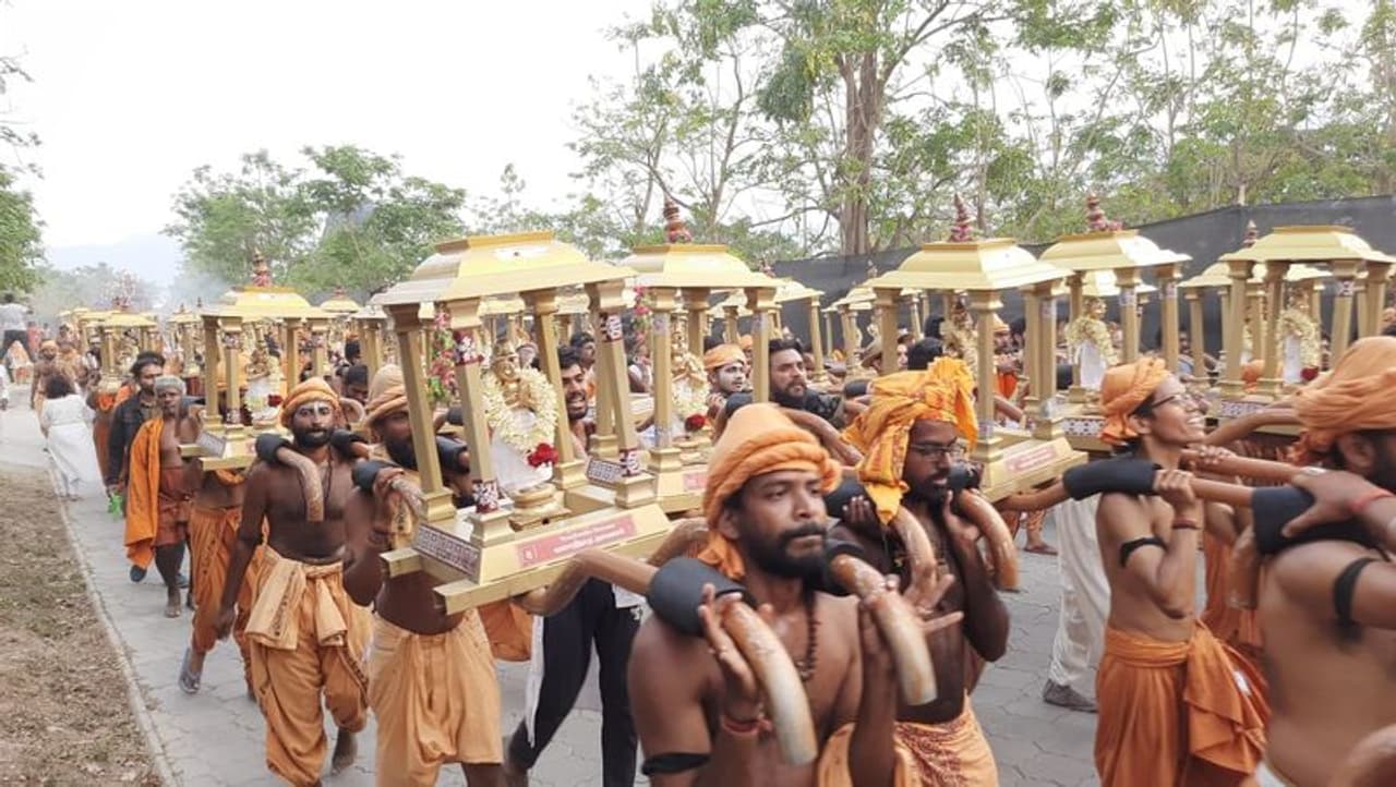 அனைத்து குழுவினரும் ஆலாந்துறை பகுதிக்கு நேற்று மதியம் வந்து சேர்ந்தனர். அங்கிருந்து 63 நாயன்மார்களை தனி தனி பல்லக்குகளில் ஏந்தி ஆதியோகி தேர்களுடன் ஈஷாவுக்கு ஊர்வலமாக வந்தனர். அவர்களுக்கு ஈஷாவின் நுழைவு வாயிலான மலைவாசலில் இருந்து தியானலிங்கம் வரை கைலாய வாத்தியங்கள் முழங்க உற்சாக வரவேற்பு அளிக்கப்பட்டது.