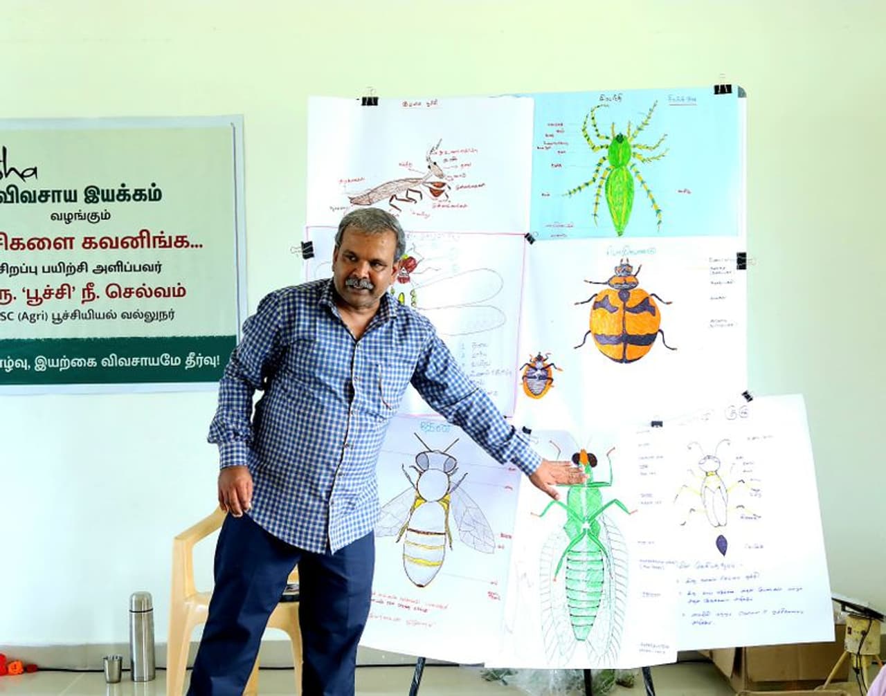 பூச்சிகளின் உடல் அமைப்பு பற்றி விரிவாக புரிந்துகொள்வதற்காக விவசாயிகளே பூச்சிகளின் படங்களை வரைந்தனர். குறிப்பாக, இயற்கை விவசாயத்தில் பூச்சிகளின் பங்கு, நன்மை செய்யும் பூச்சிகள், தீமை செய்யும் பூச்சிகள், நன்மை செய்யும் பூச்சிகளை வரவழைக்கும் வழிமுறைகள், ஒருங்கிணைந்த பூச்சி மேலாண்மை ஆகியவை குறித்து விரிவாக விளக்கம் அளிக்கப்பட்டது.