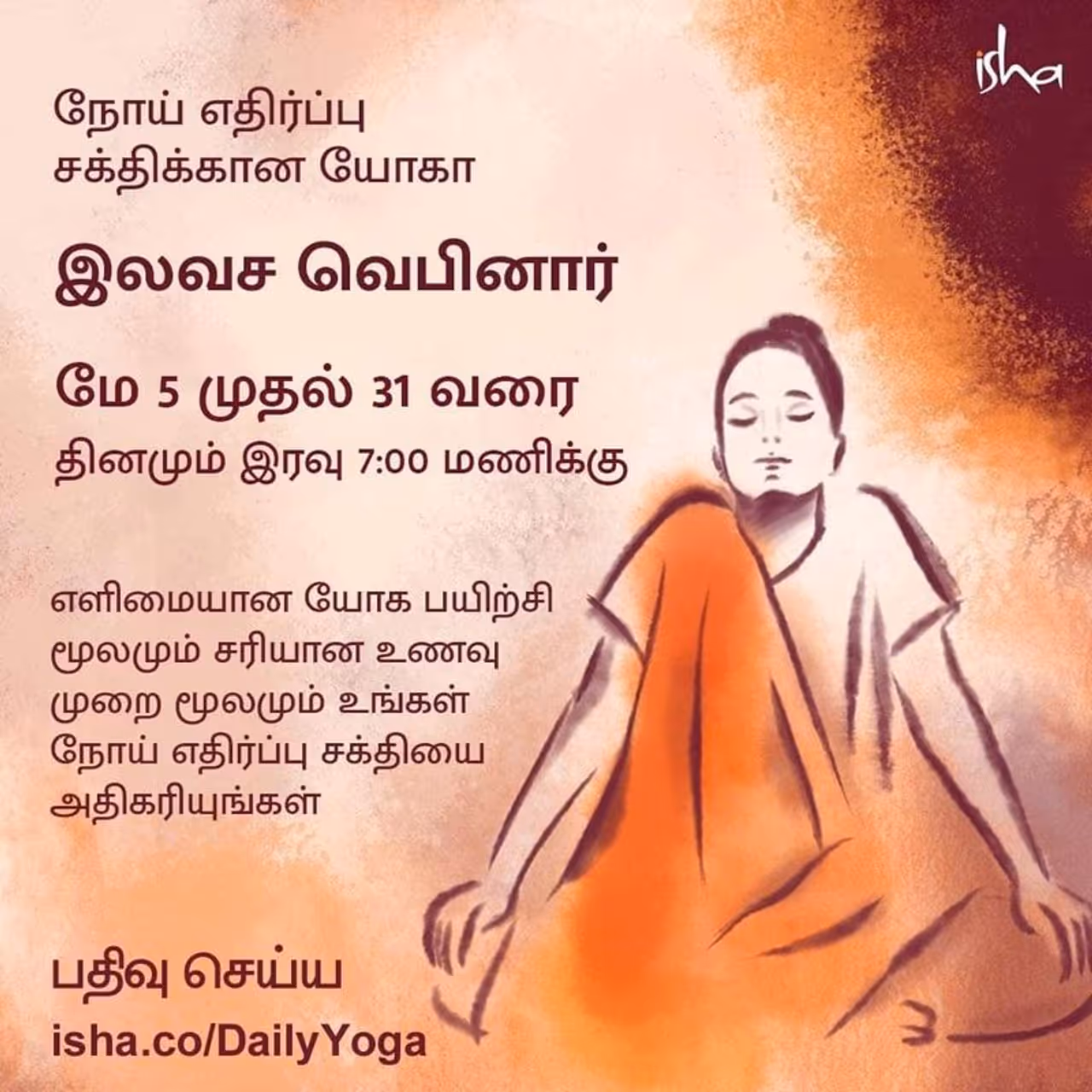 அந்த வகையில், இவ்வகுப்புகள் மே 31-ம் தேதி வரை தினமும் இரவு 7 மணிக்கு ஆன்லைனில் நடத்தப்படும். தமிழில் சுமார் 40 நிமிடங்கள் நடக்கும் இவ்வகுப்பில் பொதுமக்கள் தங்கள் வீட்டில் இருந்தப்படியே பங்கேற்கலாம். வகுப்பில் பங்கேற்க isha.co/DailyYoga என்ற இணையதள முகவரியில் முன்பதிவு செய்து கொள்வது அவசியம்.