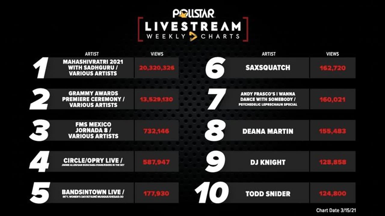 ஈஷாமஹாசிவராத்திரிவிழாவைஃபேஸ்புக், யூ-டியூப்போன்றசமூகவலைத்தளங்கள்மூலம்இந்தாண்டு சுமார் 2 கோடிபேர்நேரலையில்பார்த்துள்ளனர். இதன்மூலம்அன்றையவாரம்உலகஅளவில்அதிகம்பேர்பார்த்தநிகழ்ச்சிகளின்பட்டியலில்இவ்விழாமுதலிடத்தைபிடித்துபுதியஉலகசாதனைபடைத்துள்ளது. சர்வதேசஅளவில்புகழ்பெற்றகிராமிவிருதுவழங்கும்விழாவைகூடஇதுபின்னுக்குதள்ளியுள்ளது. 2-ம்இடம்பிடித்தகிராமிவிழாவை 1.3 கோடிபேர்மட்டுமேநேரலையில்பார்த்துள்ளனர். இத்தகவலைபிரபலபோல்ஸ்டார் (Pollstar) நிறுவனம்வெளியிடுள்ளது.
