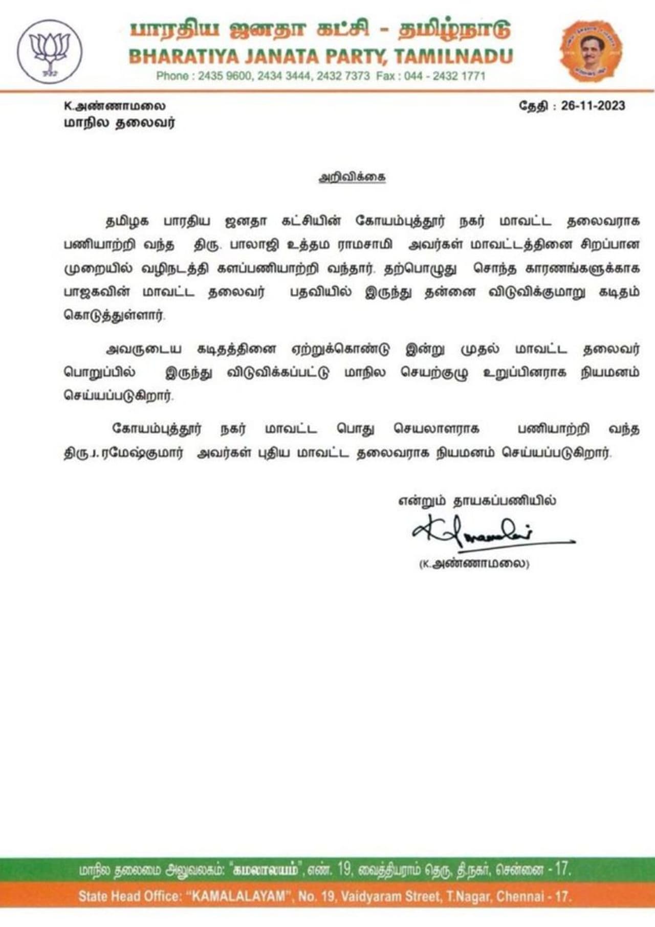 இது தொடர்பாக தமிழக பாஜக தலைமை வெளியிட்டுள்ள அறிக்கையில், “தமிழக பாரதிய ஜனதா கட்சியின் கோயம்புத்தூர் நகர் மாவட்ட தலைவராக பணியாற்றி வந்த திரு.பாலாஜி உத்தம ராமசாமி அவர்கள் மாவட்டத்தினை சிறப்பான முறையில் வழிநடத்தி களப்பணியாற்றி வந்தார்.