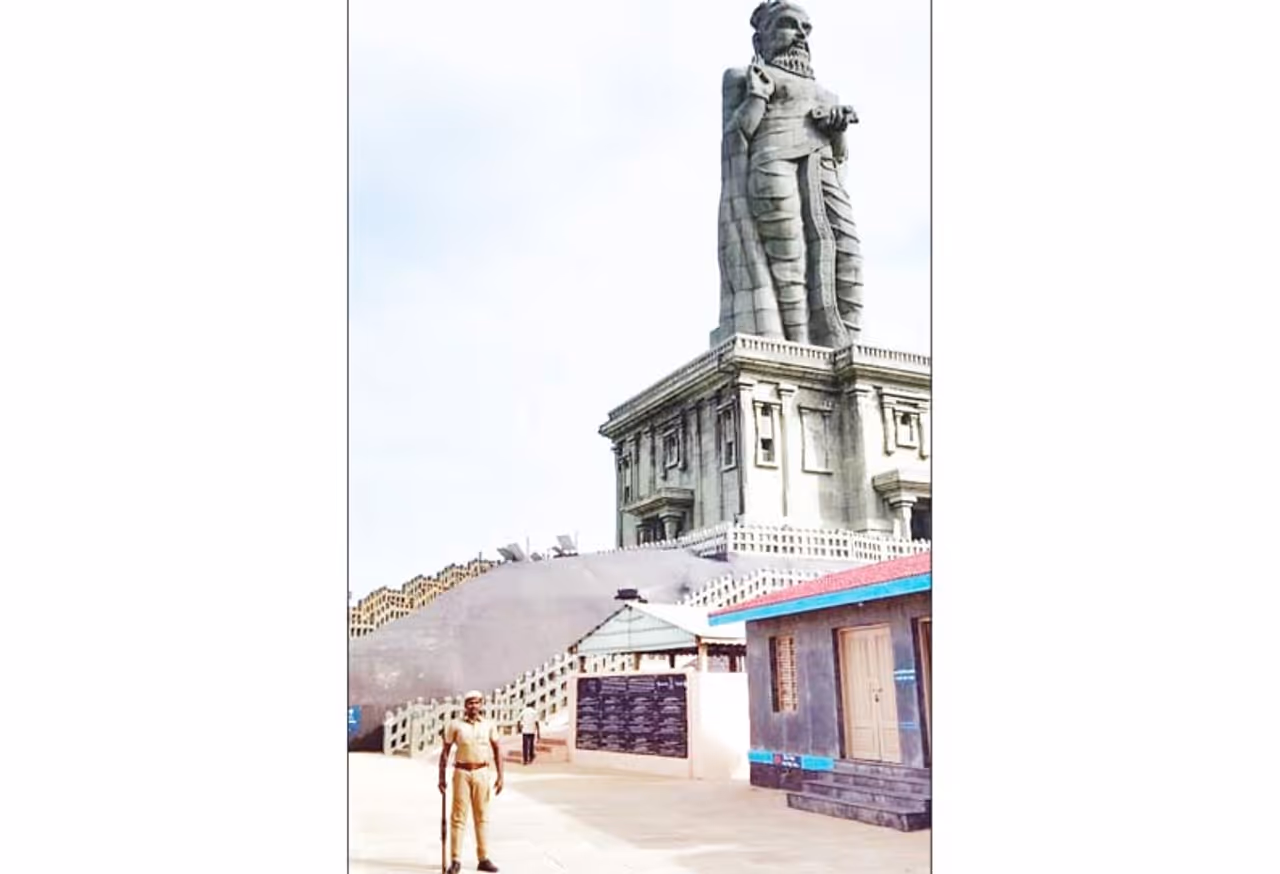 கன்னியாகுமரி கடலில் இருக்கும் திருவள்ளுவர் சிலைக்கு துப்பாக்கி ஏந்திய போலீஸ் பாதுகாப்பு போடப்பட்டுள்ளது .