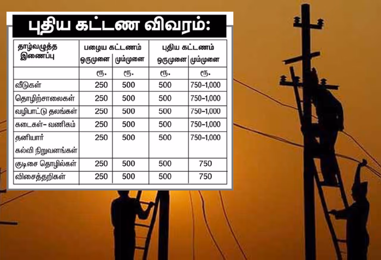 அதேபோன்று வணிக நிறுவனங்கள், தனியார் கல்வி நிறுவனங்கள், வழிபாட்டு தலங்கள், குடிசை தொழில்கள், விசைத்தறி கூடங்கள் போன்றவைகளுக்கும் புதிய கட்டணம் 1000 ரூபாய் வரை அதிகரித்து அறிவிக்கப்பட்டுள்ளது. அனைத்து பிரிவு மின் இணைப்பு பெயர் மாற்றம் செய்வதற்கான கட்டணம் 200 லிருந்து 300 ஆக அதிகரித்துள்ளது. இந்த கட்டண உயர்வு அனைத்தும் நேற்றிலிருந்து அமலுக்கு வந்திருக்கிறது.