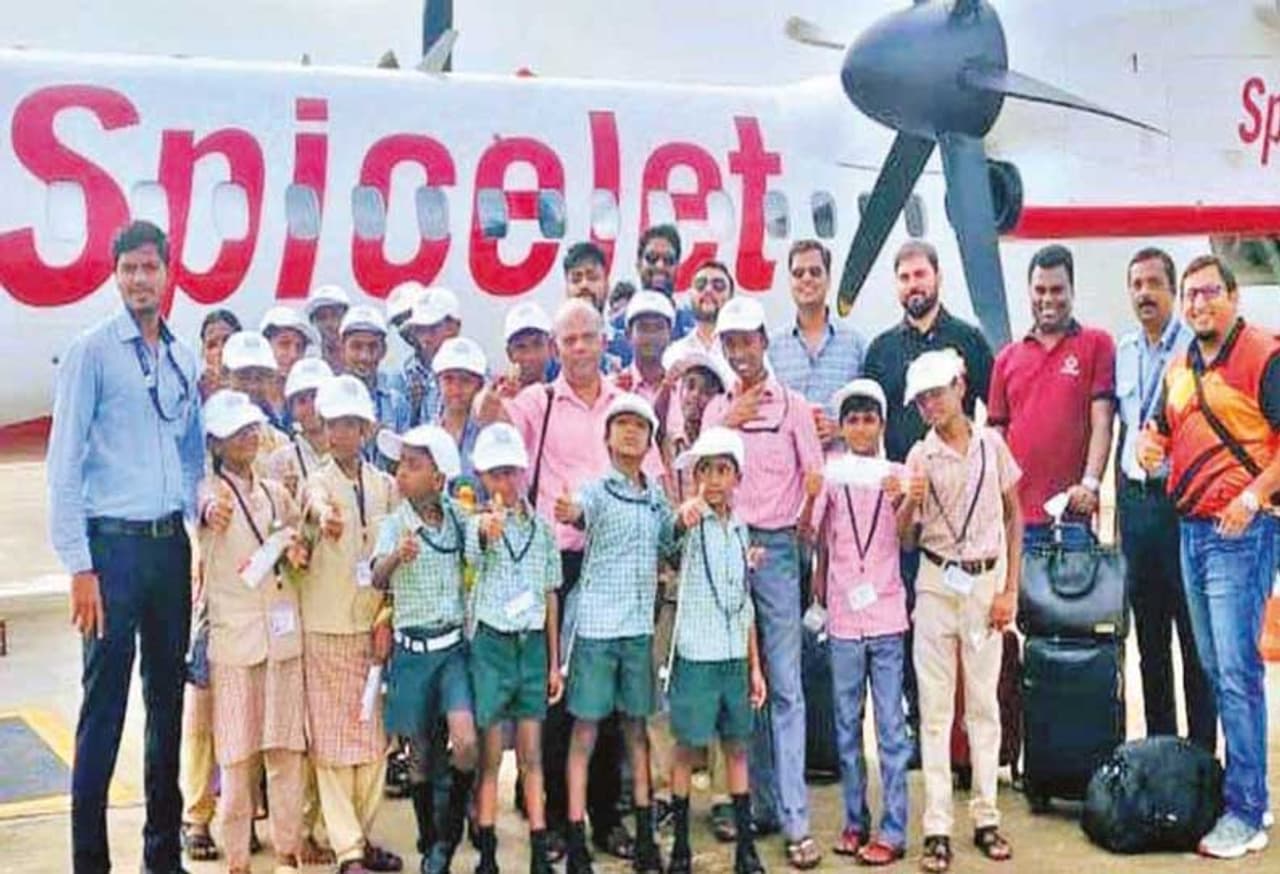 சிவகாசி அரசு பள்ளி மாணவர்கள் மதுரையில் இருந்து விமானம் மூலம் சென்னைக்கு தனியார் தொண்டு நிறுவனம் மூலம் அழைத்து வரப்பட்டனர்.
