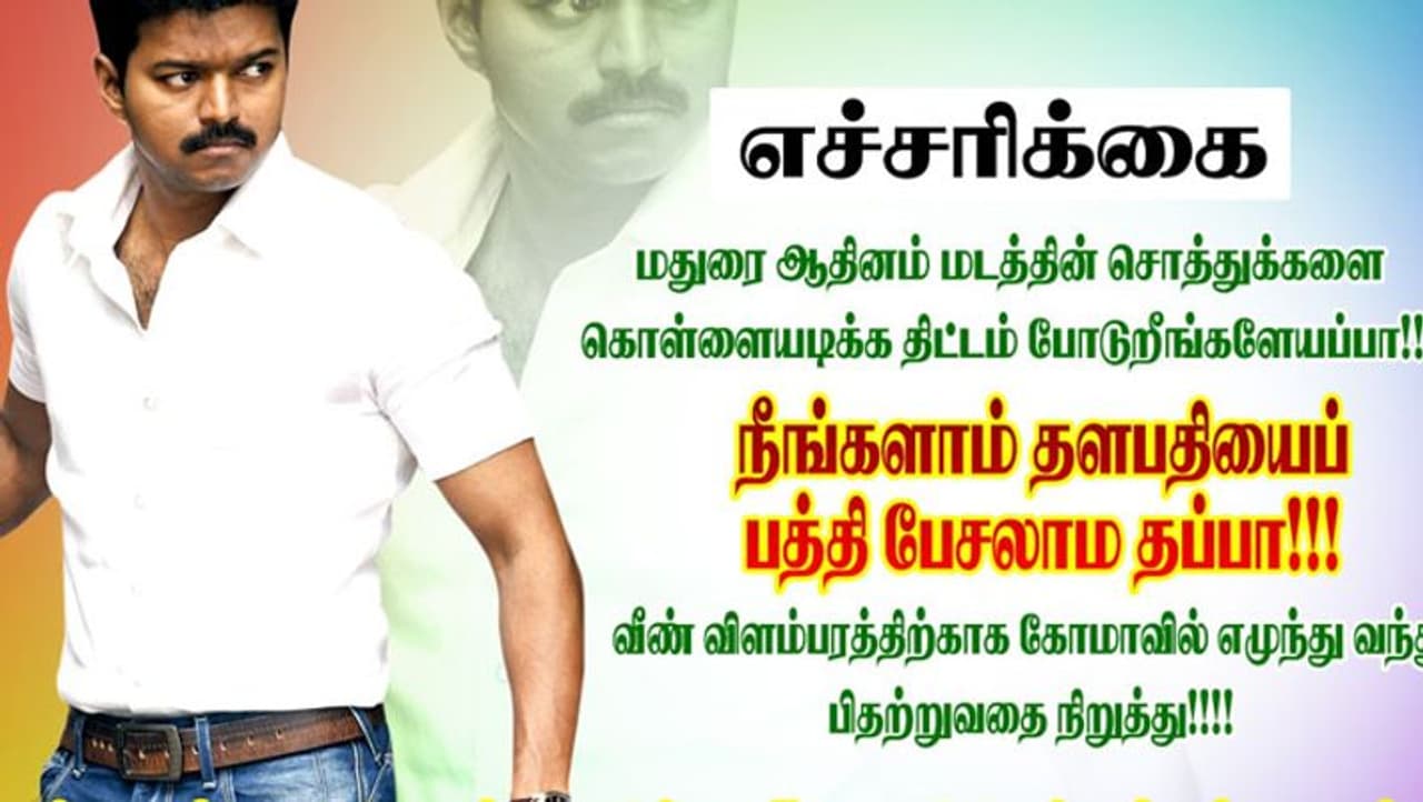சமீபத்தில் நடைபெற்ற துறவியர் மாநாடு பொதுக்கூட்டத்தில் பேசிய மதுரை ஆதினம் தமிழ் சினிமாவின் முண்ணனி நடிகரான நடிகர் விஜய் நடித்த துள்ளாத மனமும் துள்ளும் திரைப்படத்தில் விநாயக கடவுளை கேலியாக பேசியதாகவும் இதனால் நடிகர் விஜய் நடித்த திரைப்படத்தை யாரும் பார்க்க கூடாது என பேசினார். இந்த பேச்சானது விஜய் ரசிகர்கள் மத்தியில் பெரும் சலசலப்பை ஏற்படுத்தியது. இந்நிலையில் மதுரை ஆதினத்தின் பேச்சை கண்டித்து மதுரை வடக்கு மாவட்ட இளைஞரணி தலைமை தளபதி விஜய் மக்கள் இயக்கம் சார்பில் மதுரை மாநகர் முழுவதிலும் சுவரொட்டிகளை ஒட்டியுள்ளனர்.