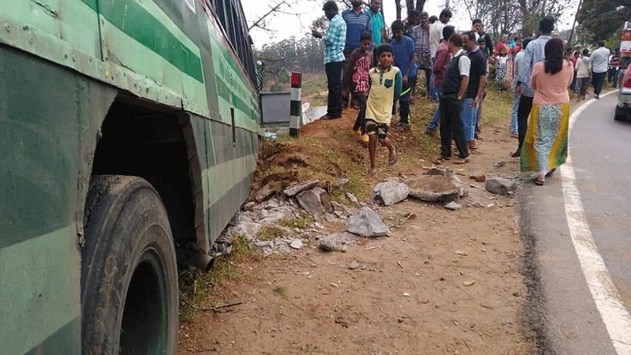 திண்டுக்கல் மாவட்டம், பழனியிலிருந்து உதகைக்கு அரசுப் பேருந்து நேற்று பிற்பகல் வந்து கொண்டிருந்தது. இப்பேருந்தில் 40-க்கும் மேற்பட்ட பயணிகள் பயணம் செய்தனர். பேருந்தை செல்வம் என்பவர் ஓட்டி வந்தார். உதகைக்கு வரும் வழியில் பிக்கட்டி பகுதியில் சாலை விரிவாக்கப் பணிகள் நடைபெற்று கொண்டிருந்த இடத்தில் இப்பேருந்து வந்தபோது, திடீரென ஓட்டுநரின் கட்டுப்பாட்டை இழந்து, இடதுபுறம் இருந்த பள்ளத்தில் இறங்கியது. இதனால், பேருந்திலிருந்த பயணிகள் அலறியபடி கூச்சலிட்டனர்.