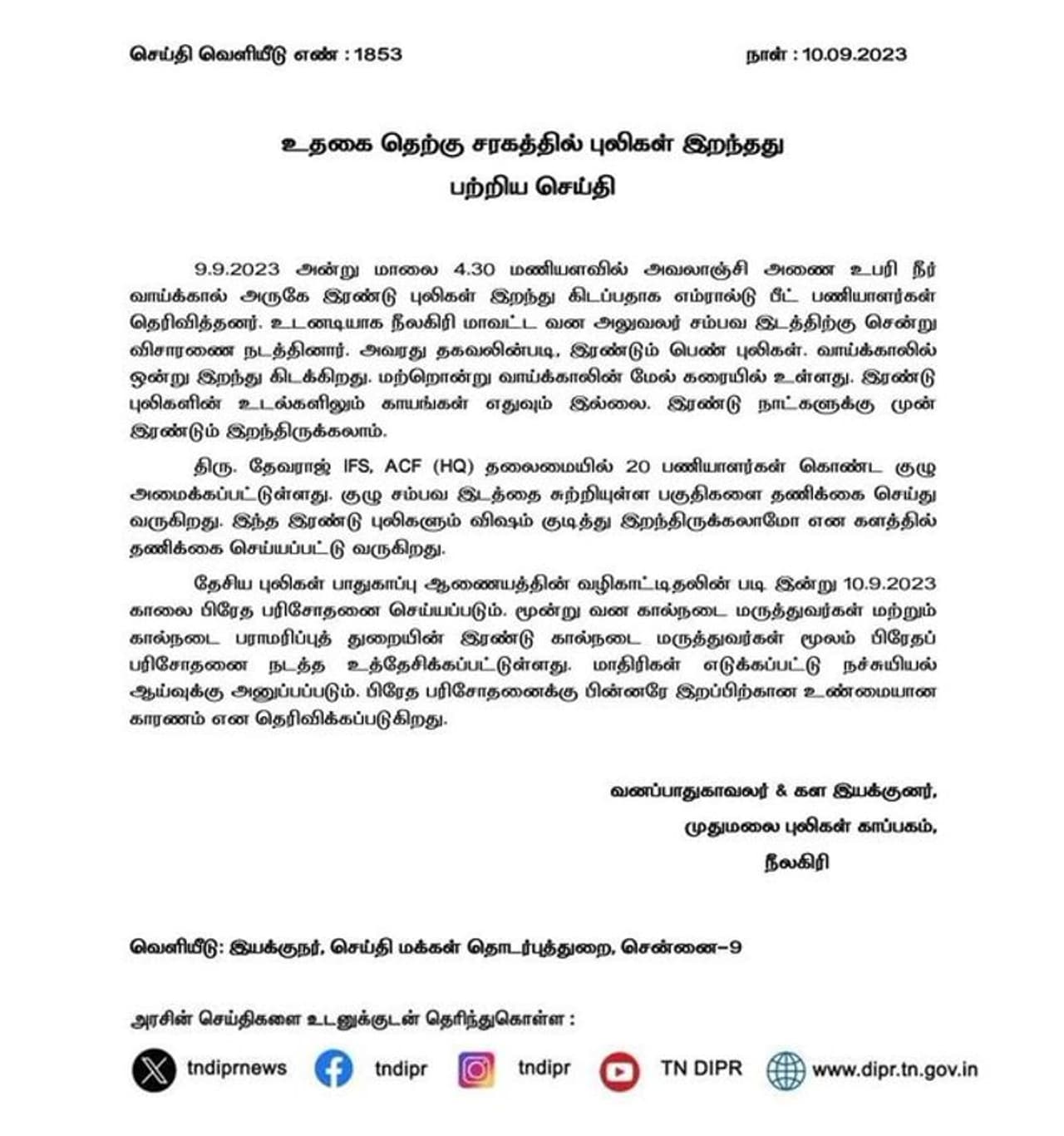 இதுதொடர்பாக முதுமலை புலிகள் காப்பகம் வனப்பாதுகாவலர் வெளியிட்டுள்ள அறிக்கையில்;- 9.9.2023 அன்று மாலை 4.30 மணியளவில் அவலாஞ்சி அணை உபரி நீர் வாய்க்கால் அருகே இரண்டு புலிகள் இறந்து கிடப்பதாக எம்ரால்டு பீட் பணியாளர்கள் தெரிவித்தனர். உடனடியாக நீலகிரி மாவட்ட வன அலுவலர் சம்பவ இடத்திற்கு சென்று விசாரணை நடத்தினார். அவரது தகவலின்படி, இரண்டும் பெண் புலிகள். வாய்க்காலில் ஒன்று இறந்து கிடக்கிறது. மற்றொன்று வாய்க்காலின் மேல் கரையில் உள்ளது. இரண்டு புலிகளின் உடல்களிலும் காயங்கள் எதுவும் இல்லை. இரண்டு நாட்களுக்கு முன் இரண்டும் இறந்திருக்கலாம்.