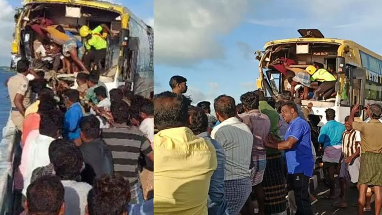 இன்று காலை சென்னையில் இருந்து ராமேஸ்வரம் நோக்கி வந்து கொண்டிருந்த தனியார் சொகுசு ஆம்னி பேருந்து ஒன்று பாம்பன் பாலத்தில் வந்து கொண்டிருந்த போது முன்னால் சென்ற வாகனத்தை முந்த முயன்ற போது எதிரே வந்த அரசு பேருந்து மீது ஆம்னி பேருந்து நேருக்கு நேர் மோதியது. இதில் கட்டுப்பாட்டை இழந்த ஆம்னி பேருந்து பாம்பன் பாலத்தின் அருகே உள்ள நடை மேடை மீது ஏறி பாலத்தின் தடுப்பு சுவர் மீது மோதி கடலில் விழும் சூழ்நிலை ஏற்பட்டது.