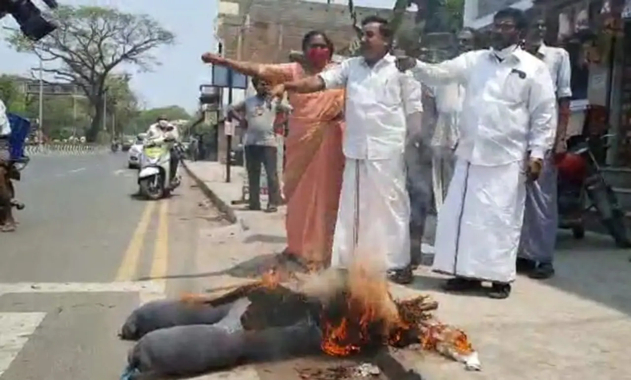 அதேபோல் முதலமைச்சரின் சொந்த ஊரும், சட்டமன்ற தொகுதியுமான எடப்பாடியில் அதிமுகவைச் சேர்ந்த பெண்கள், ஆண்கள் என 2 ஆயிரத்திற்கும் மேற்பட்டோர் கையில் கருப்புக்கொடியுடன் பிரம்மாண்ட பேரணி நடத்தினர். நாவடக்கம் இல்லாமல் முதலமைச்சரை தரக்குறைவாக விமர்சித்த ஆ.ராசாவின் உருவ பொம்மையை எடப்பாடி பேருந்து நிலையம் அருகே எதிர்த்து தங்களுடைய எதிர்ப்பை தெரிவித்தனர்.